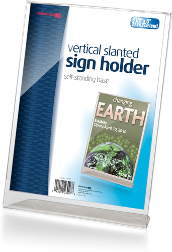 Self-standing 8½” x 11” slanted sign holder provides angled view.