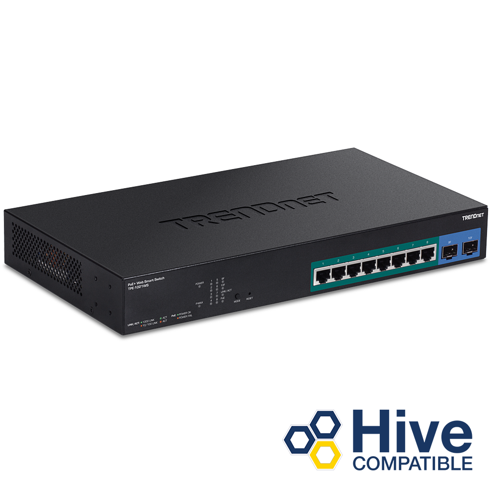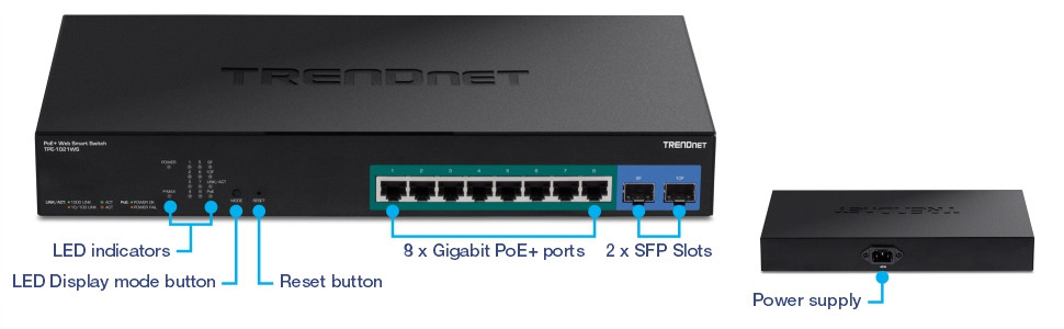 Provides 8 Gigabit PoE+ ports, 2 SFP slots, a 20Gbps switching capacity, and 1U 19” rackmount design with brackets included