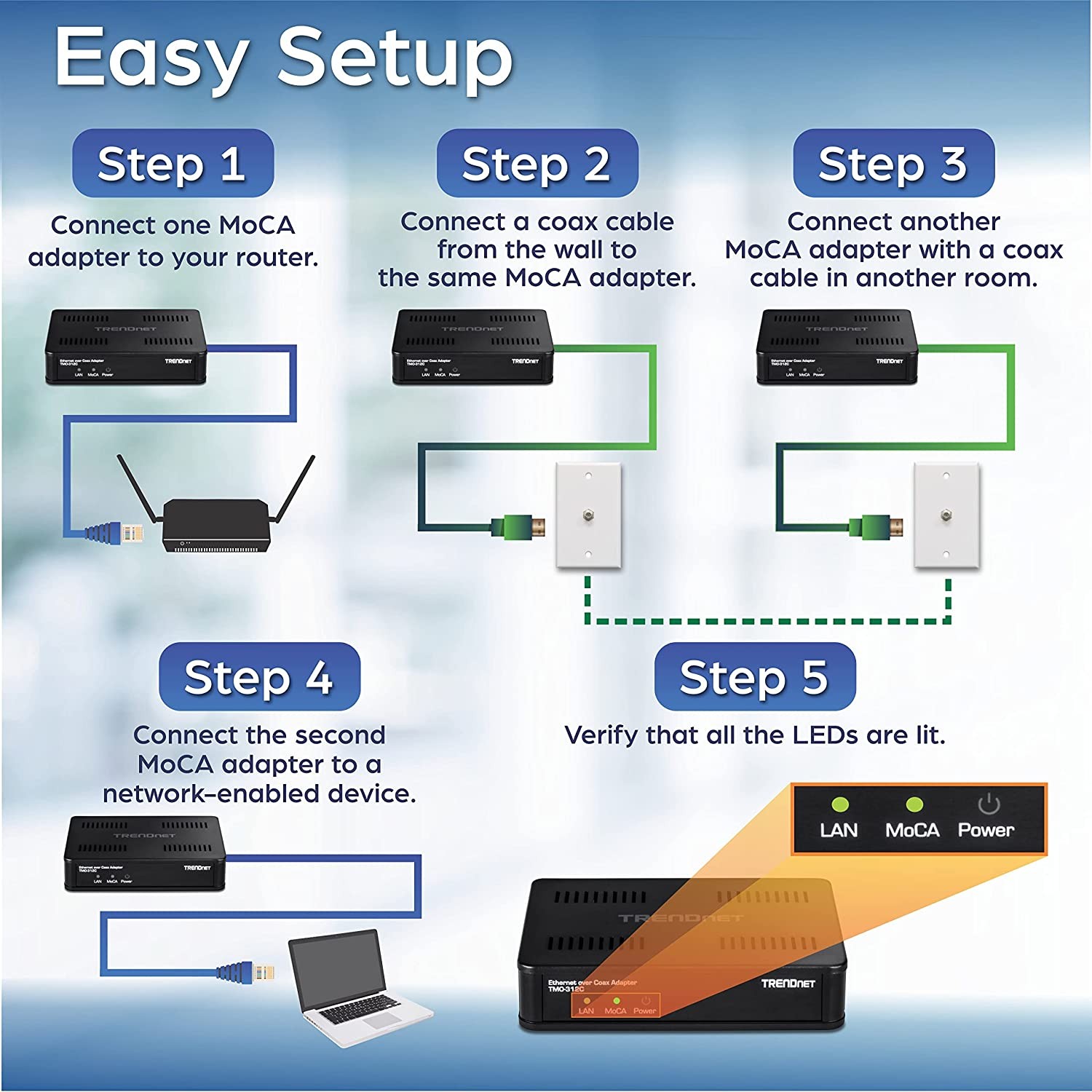 These MoCA coax to Ethernet adapters require no configuration, simply connect the adapters to the MoCA network to extend your network over existing coaxial cabling