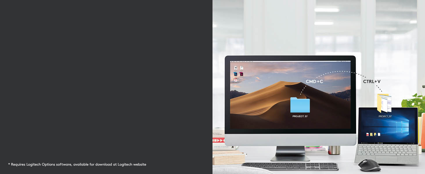 Seamlessly control multiple computers across Windows and macOS with your Flow-enabled mouse. Effortlessly transfer text, images, and files between computers – just copy on one, paste to the other