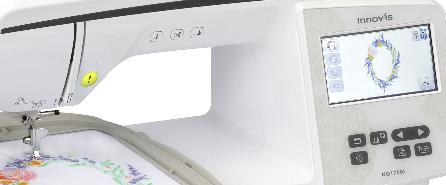 The sleek white NQ1700E comes with over 250 built-in embroidery designs, a host of innovative features such as an Auto Presser Foot (down to start), easy bobbin winding, and an automatic thread cutter you’ll be creating as soon as you open the box.