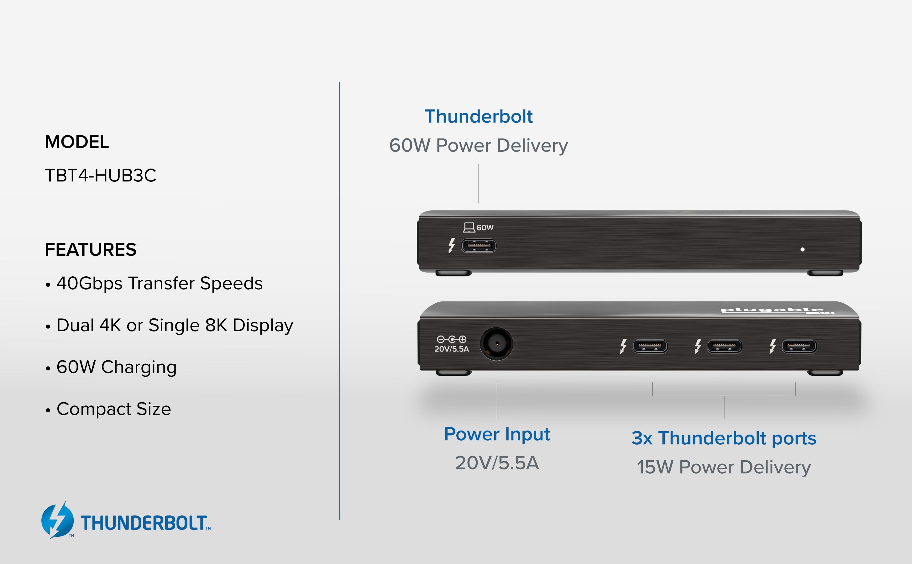 The TBT4-HUB3C is designed for speed–data transfer speeds up to 40Gbps, power–60W charging to keep your battery topped off, and dependability–built and tested to comply with Plugable’s highest quality standards. And when you don’t need data, it even works as a standalone charging hub.