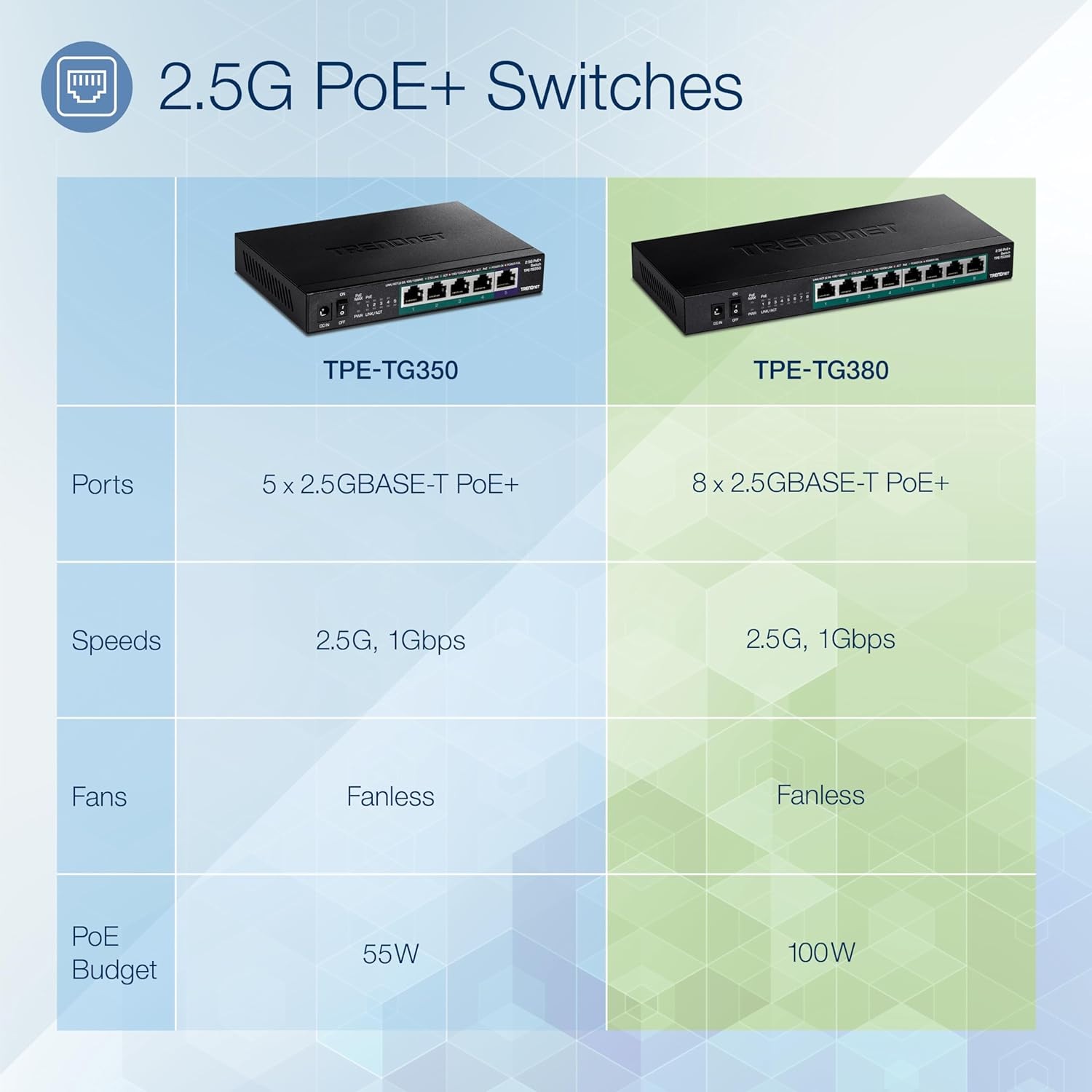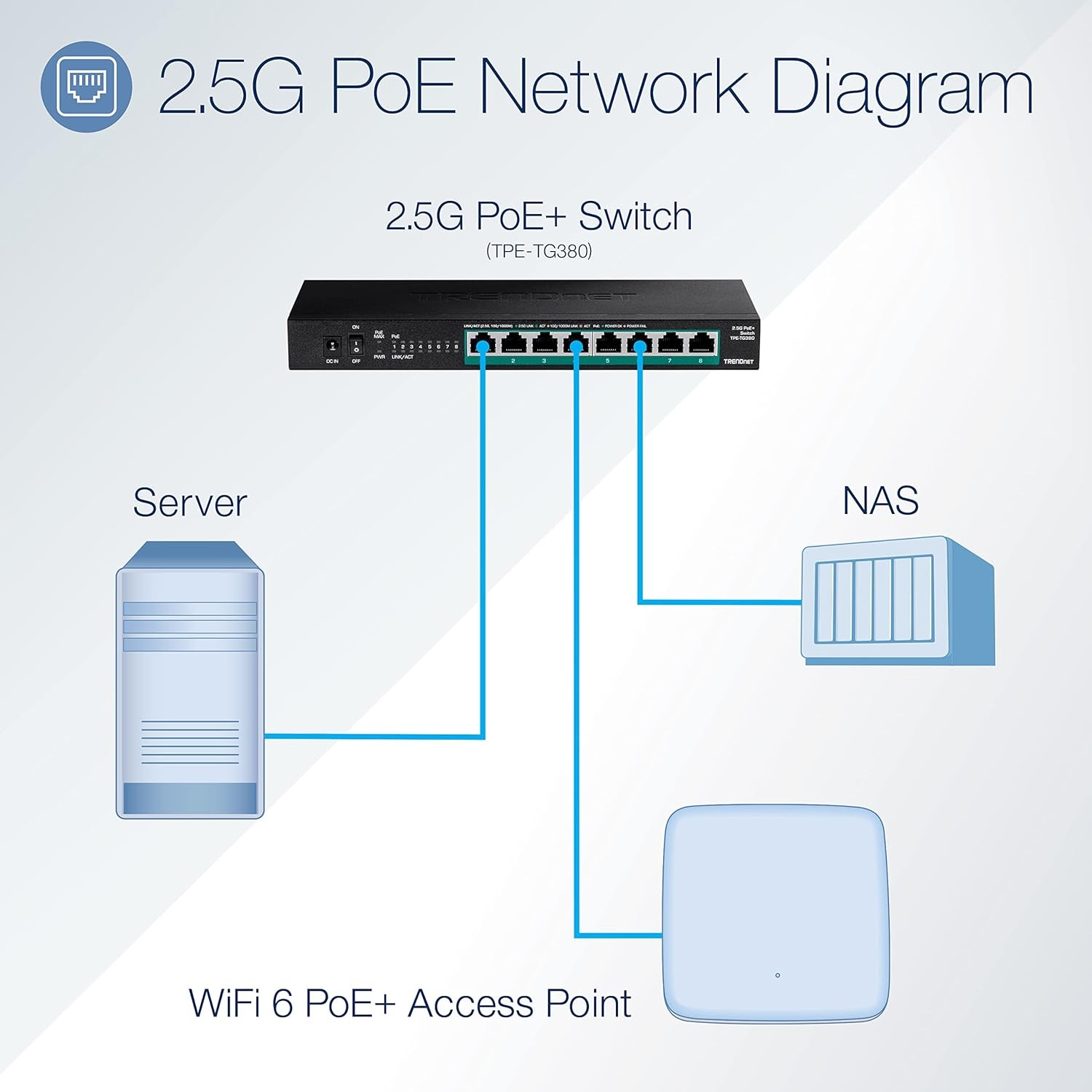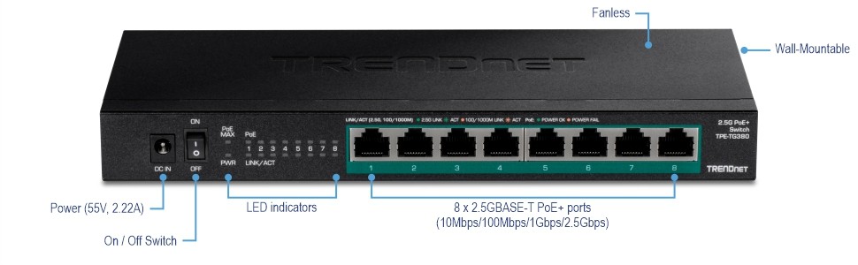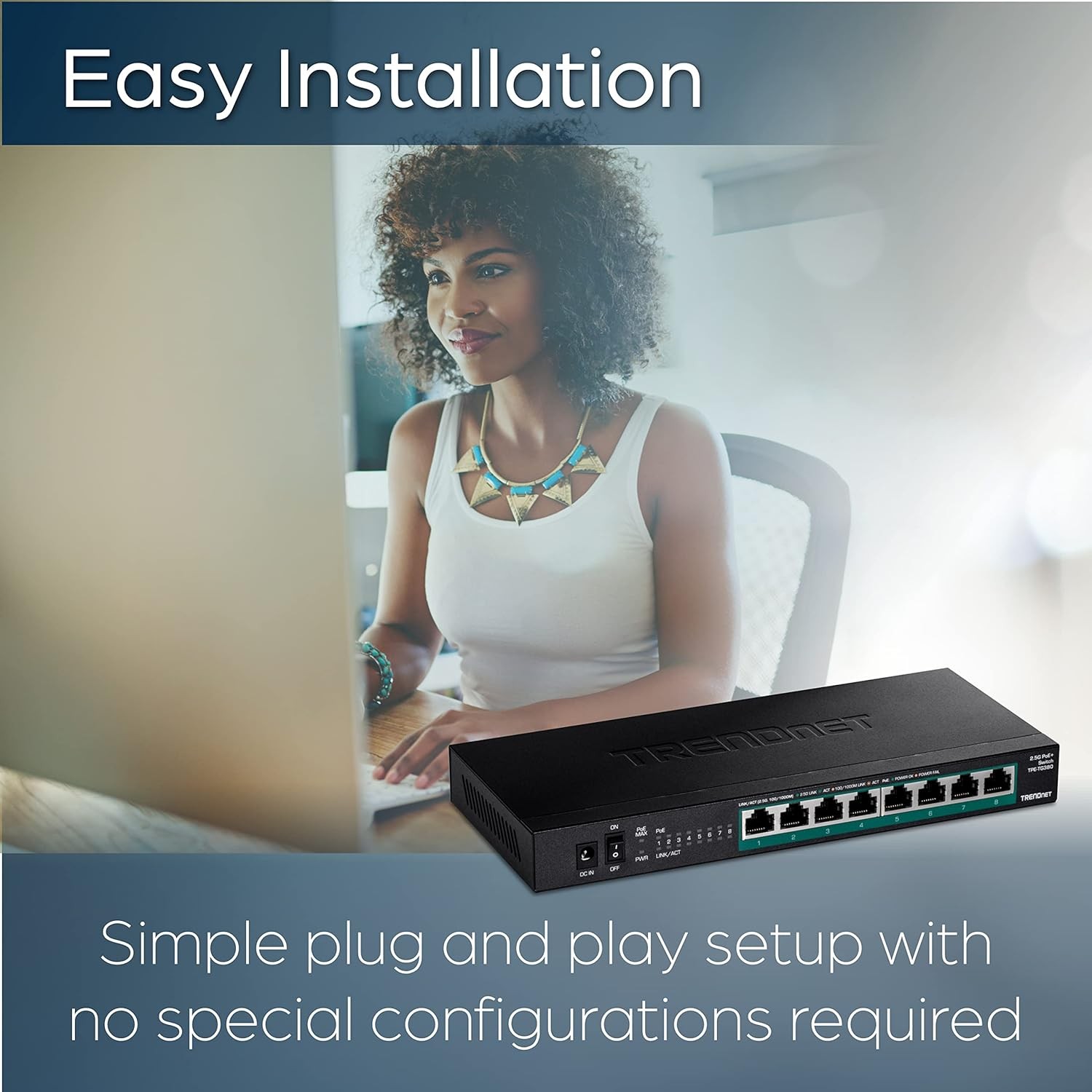 Expand your network’s bandwidth and reduce traffic bottlenecks with TRENDnet’s Unmanaged 2.5G PoE+ Switches. These 2.5G PoE+ switches are equipped with 2.5GBASE-T RJ-45 ports that provide multi-gigabit speeds capable of up to 2.5Gbps over your existing Cat5e or better cabling. Each high-speed 2.5G PoE+ switch features a durable metal enclosure and can be mounted to the wall for setup flexibility. The fanless design lowers energy consumption and eliminates distracting operating noise. TRENDnet’s reliable 2.5G PoE+ switches are cost-effective solutions to increase your network’s throughput. A 100W total PoE power budget on this multi-gig PoE+ switch supplies up to eight PoE+ devices with up to 30W per port.