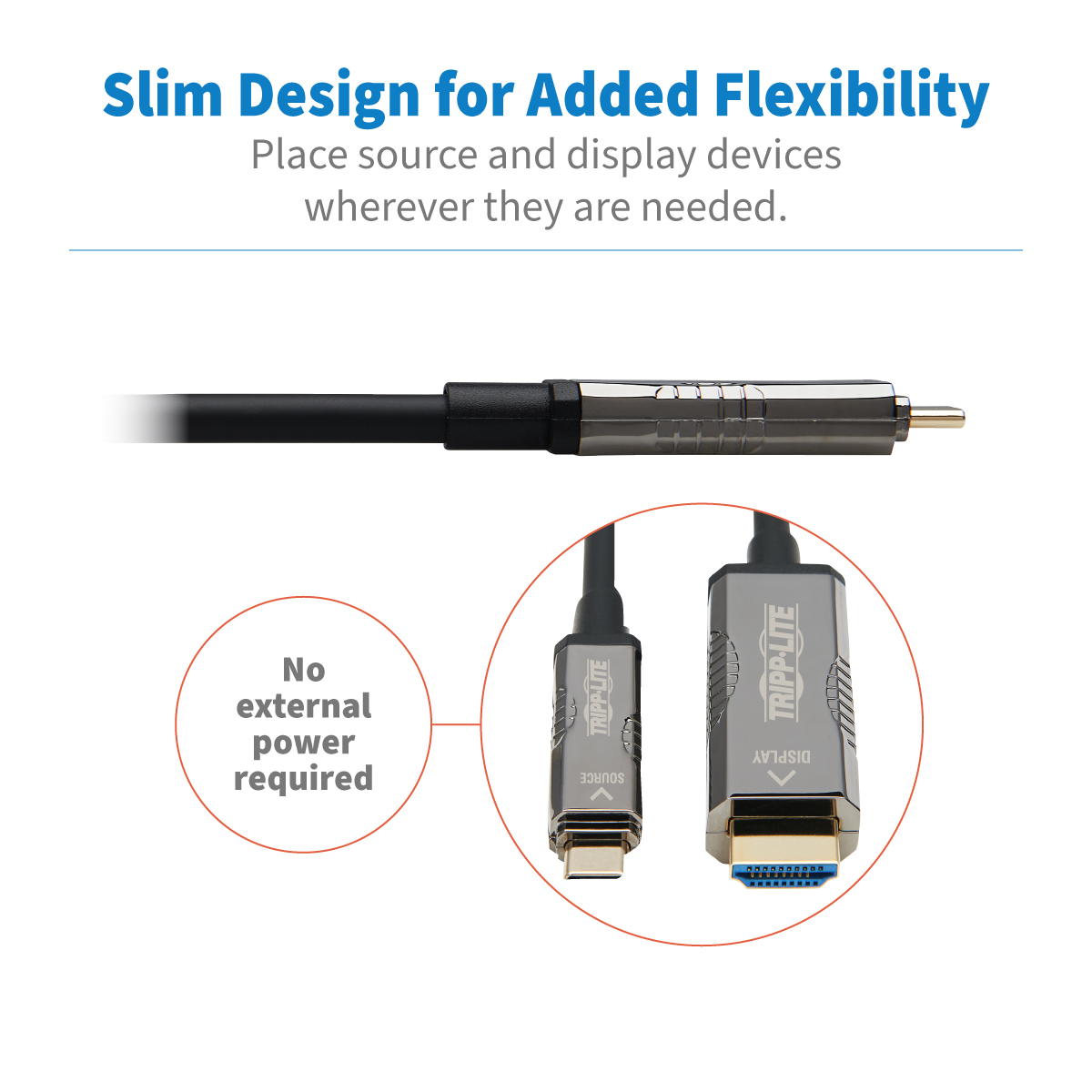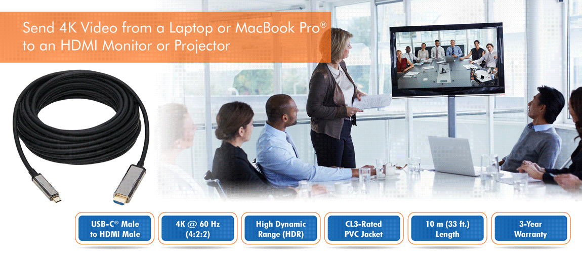 This 10 m (33 ft.) cable connects a USB-C or Thunderbolt™ 3 laptop, MacBook®, smartphone or tablet to an HDTV, monitor or projector with HDMI input. It uses optical fiber to transmit audio/video signals with no latency or loss and is immune to EMI/RFI line noise.