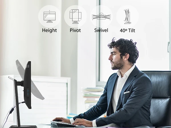 With advanced ergonomic features including swivel, pivot, height adjust, and tilt, this monitor is designed to provide a greater range of adjustment for increased productivity and comfort. The monitor can tilt up to 40-degrees, making it ideal for use during group discussions and screen sharing.