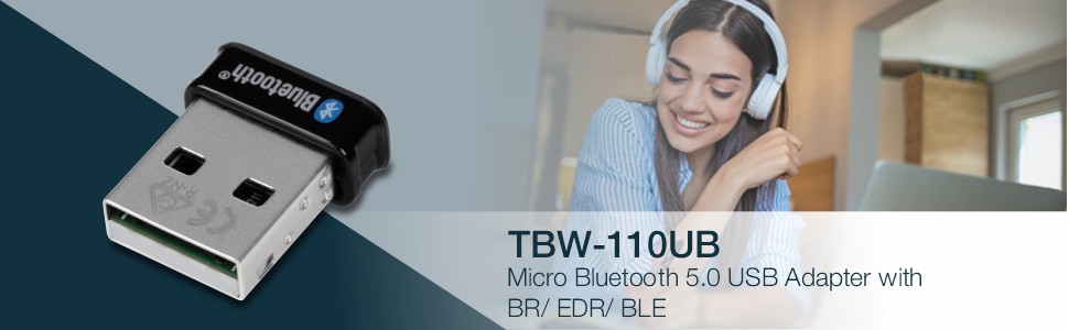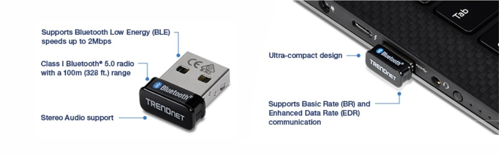 TRENDnet’s Micro Bluetooth 5.0 USB Adapter with BR/EDR/BLE, model TBW-110UB, connects a Windows® computer to Bluetooth® devices, such as keyboards, headsets, and mobile devices. This compact Bluetooth adapter for PC is about the size of a penny, which is great for users who need to take it on the road. Experience reliable class 1 Bluetooth connectivity for distances of up to 100m (328 ft.) with high-quality stereo audio support. This Bluetooth adapter for PC supports Basic Rate/Enhanced Data Rate (BR/EDR) speeds up to 3Mbps, and Bluetooth Low Energy (BLE) speeds up to 2Mbps.