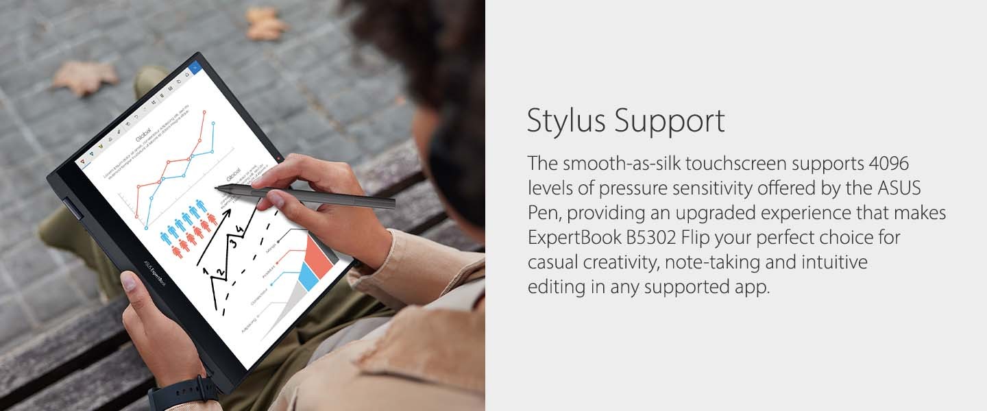 With a 360° flip hinge the ExpertBook B5302 Flip can be used in several different ways, including both tent and tablet modes, making it easier for instant collaboration, content-sharing or presentations. Additionally, it is engineered to cope up with the everyday knocks & bumps in a business setup owing to its military-grade toughness & the ASUS internal torture tests it undergoes.