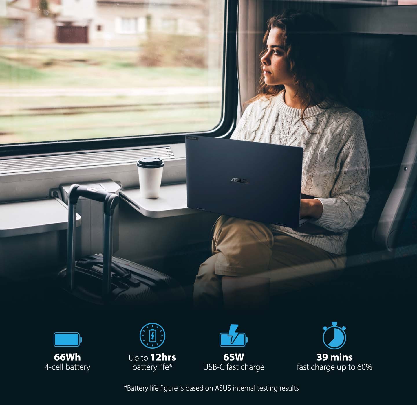ASUS ExpertBook B5302 Flip never lets you down, be it extended work hours or a long-haul flight. It provides all-day battery life on a single charge, aided by energy-efficient Panel Self Refresh technology. Additionally, the fast-charge technology lets you charge the battery to up to 60% capacity in as little as 39 minutes, so you're up and running in no time.