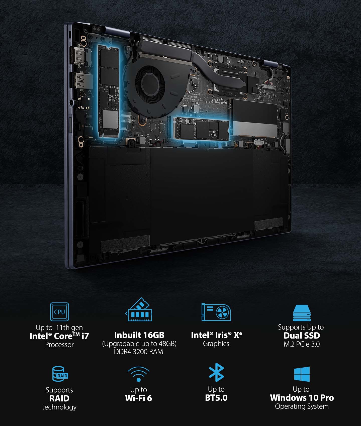 graphics coupled with up to 48 GB upgradable DDR4 memory and support for up to dual SSD. Owing to these performance rich attributes along with the superfast Wi-Fi 6 & Bluetooth 5.0 the ExpertBook provides quick and responsive computing and enterprise-grade manageability. It also supports RAID technology for improved data reliability and faster operation.