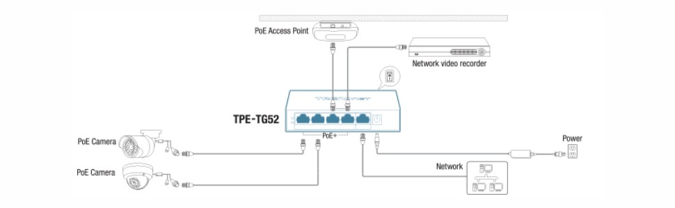 TRENDnet's 5-Port Gigabit PoE+ Switch, model TPE-TG52, reduces equipment and installation costs by delivering data and power over existing Ethernet cables. With PoE technology, users only need one set of cables to deliver both data and power. This compact network switch features four gigabit PoE+ ports and one gigabit port, with a 32W total PoE power budget. The TPE-TG52 PoE+ switch allows you to network PoE devices, such as wireless access points, IP cameras, VoIP phones, IP video encoders, access controls, and more. It features a fanless design, and has a convenient option for wall mounting.