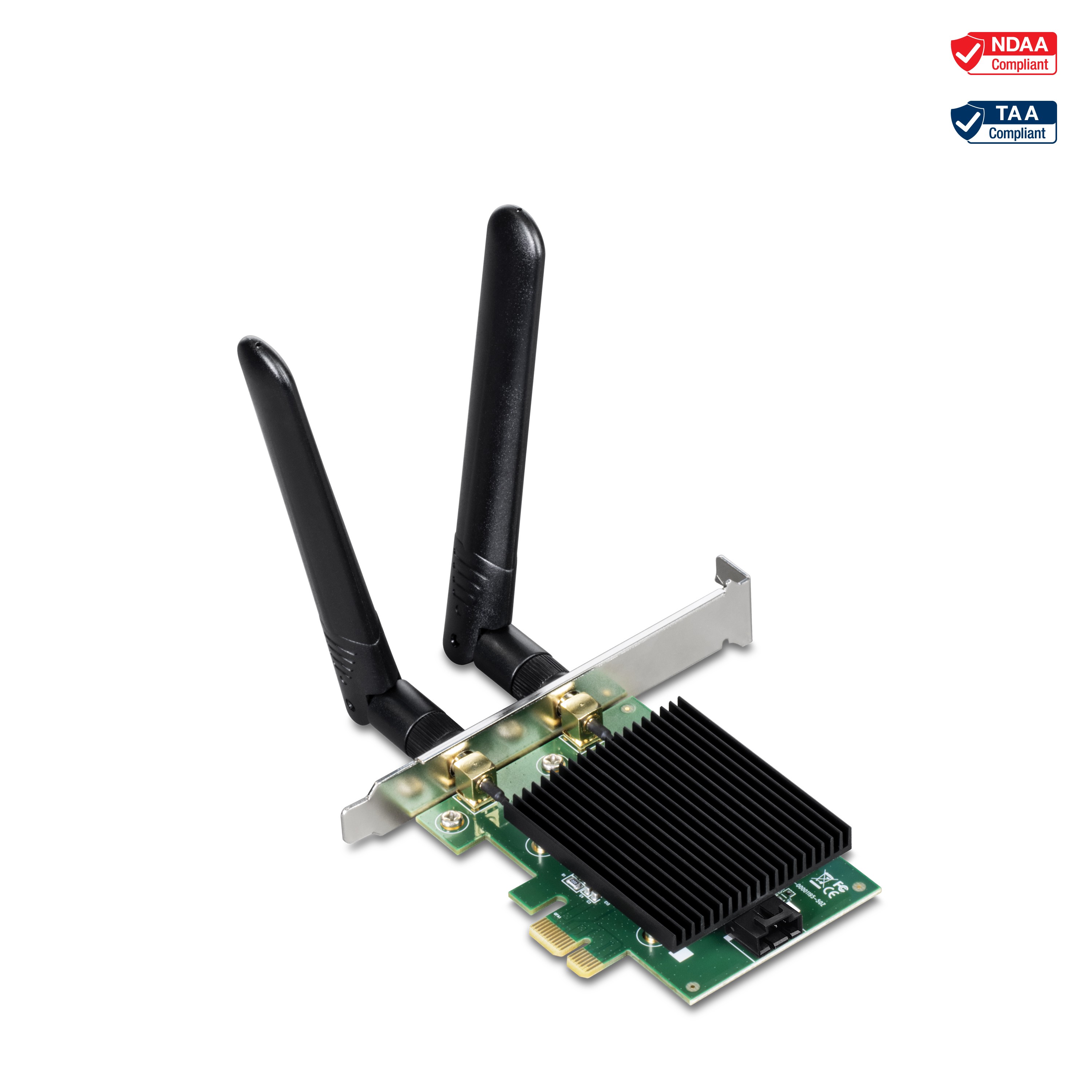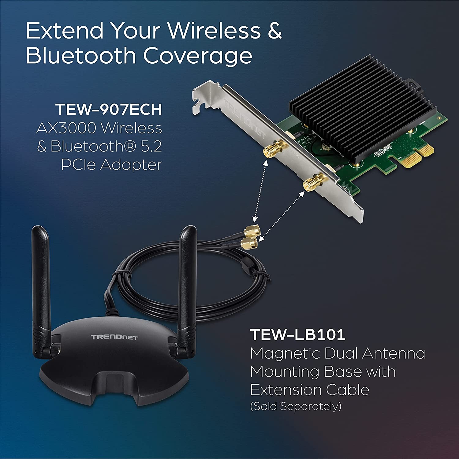 TRENDnet's AX3000 Wireless Dual Band & Bluetooth 5.2 (Class 2) PCIe Adapter, model TEW-907ECH, simultaneously provides Bluetooth and WiFi connections, allowing you to concurrently connect to a WiFi network and Bluetooth devices. Conveniently download music, videos, and pictures from a wireless internet connection, and then transfer those same files seamlessly to your Bluetooth-enabled phone or device. This WiFi Bluetooth PCIe card instantly upgrades a standard or low-profile Windows® computer to Wireless AX3000 & Bluetooth 5.2 (Class 2). Quickly connect to a high-performance Wireless AX network at 2401Mbps or to a Wireless N network at 600Mbps. For extended range, use our magnetic antenna base, TEW-LB101 (sold separately), with the WiFi Bluetooth PCIe card to relocate antennas for optimal signal coverage.