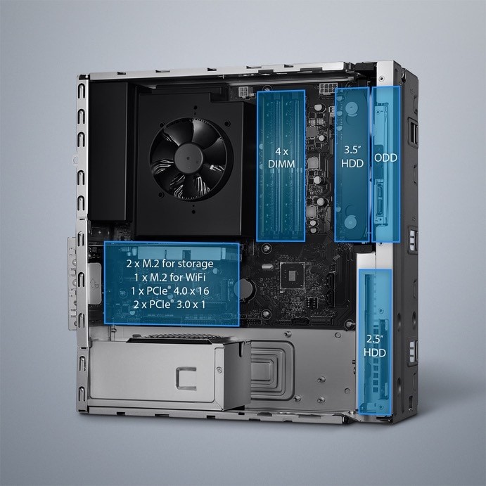 To ensure stable performance in the compact chassis, ExpertCenter D7 SFF employs an innovative multi-channel cooling system. This comprises dedicated, isolated air chambers that allow independent heat-venting channels for the PC’s main thermal generators — the CPU, GPU and power supply. ExpertCenter D7 SFF also includes the exclusive MyASUS app to optimize the operation of the CPU and system fans, automatically moderating the speeds and switching them off completely when possible, striking the perfect balance between maximum performance and minimum noise.