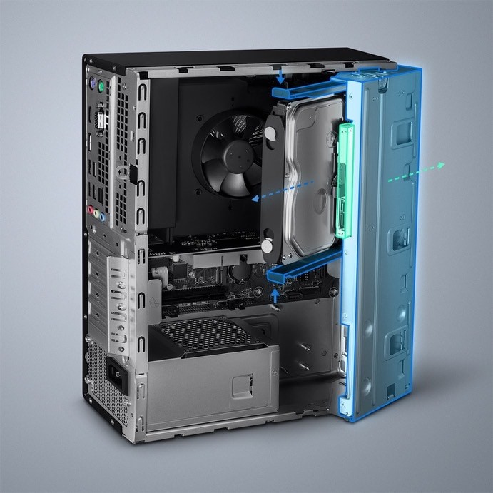 ExpertCenter D7 SFF has a tool-free chassis design so you can open it up with no tools required. The HDD and ODD can also be easily pulled out with just fingers. This saves time and effort, making component upgrades and routine servicing easy.