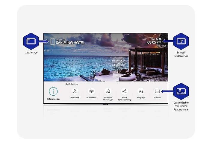 Each Samsung display includes an intuitive, customizable home menu that streamlines content exchange between healthcare operators and guests. Content managers can easily incorporate images, logos and feature icons specific to guest needs while reinforcing special offers and branding.