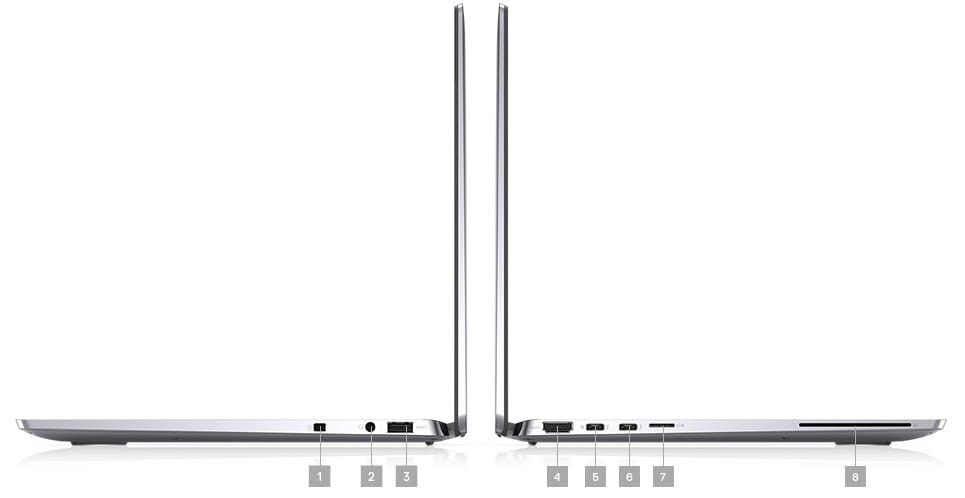 1. Wedge-shaped lock slot | 2. Audio combo jack | 3. USB 3.2 Gen 1 (with power share) | 4. HDMI 2.0 | 5. Thunderbolt™ 4 with Power Delivery and DisplayPort (USB Type-C™) | 6. Thunderbolt™ 4 with Power Delivery and DisplayPort (USB Type-C™) | 7. uSD reader | 8. Smart Card Reader
