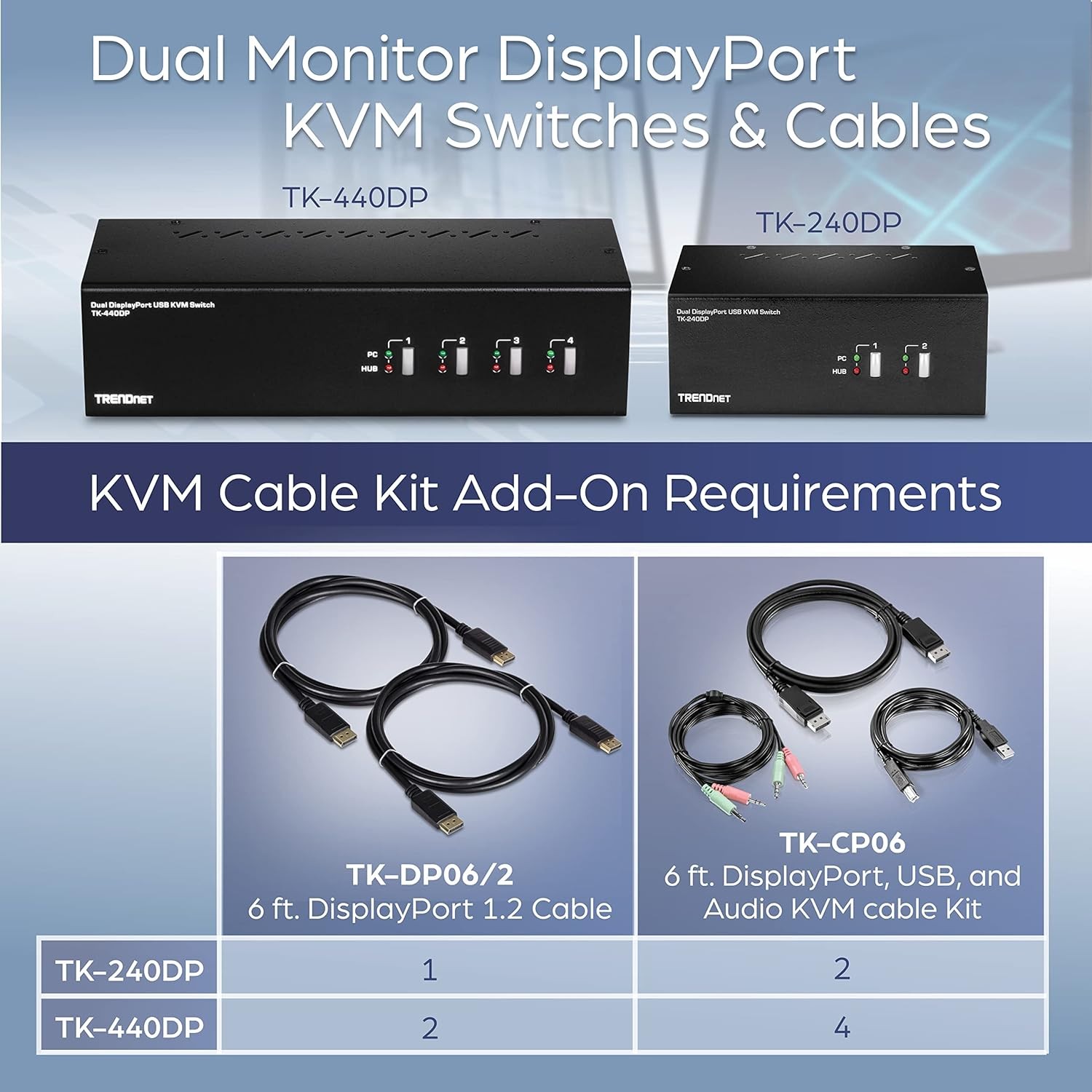 TRENDnet’s 6 ft. DisplayPort 1.2 Cable – 2 Pack, model TK-DP06, is designed to connect a DisplayPort computer to a DisplayPort monitor. The DisplayPort cable 2-pack can also be used with our Dual Monitor DisplayPort KVM Switches, modelsTK-240DP and TK-440DP.