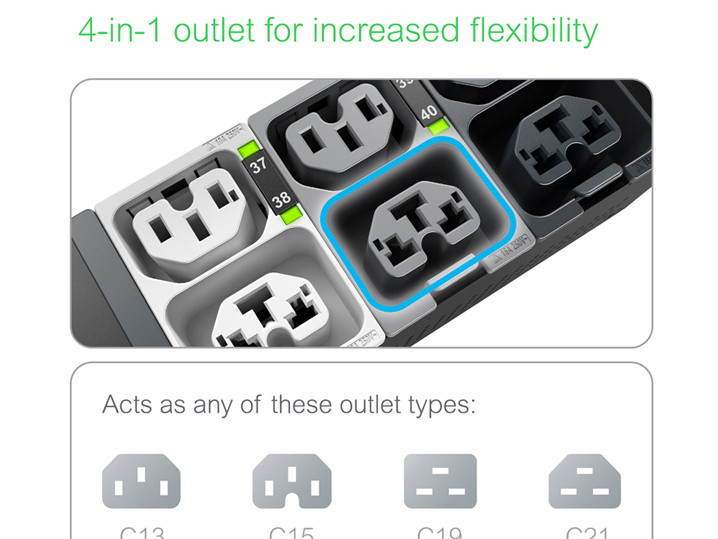 Innovative combination C13/C15/C19/C21 outlet for many rack layouts, configurations, & refreshes.