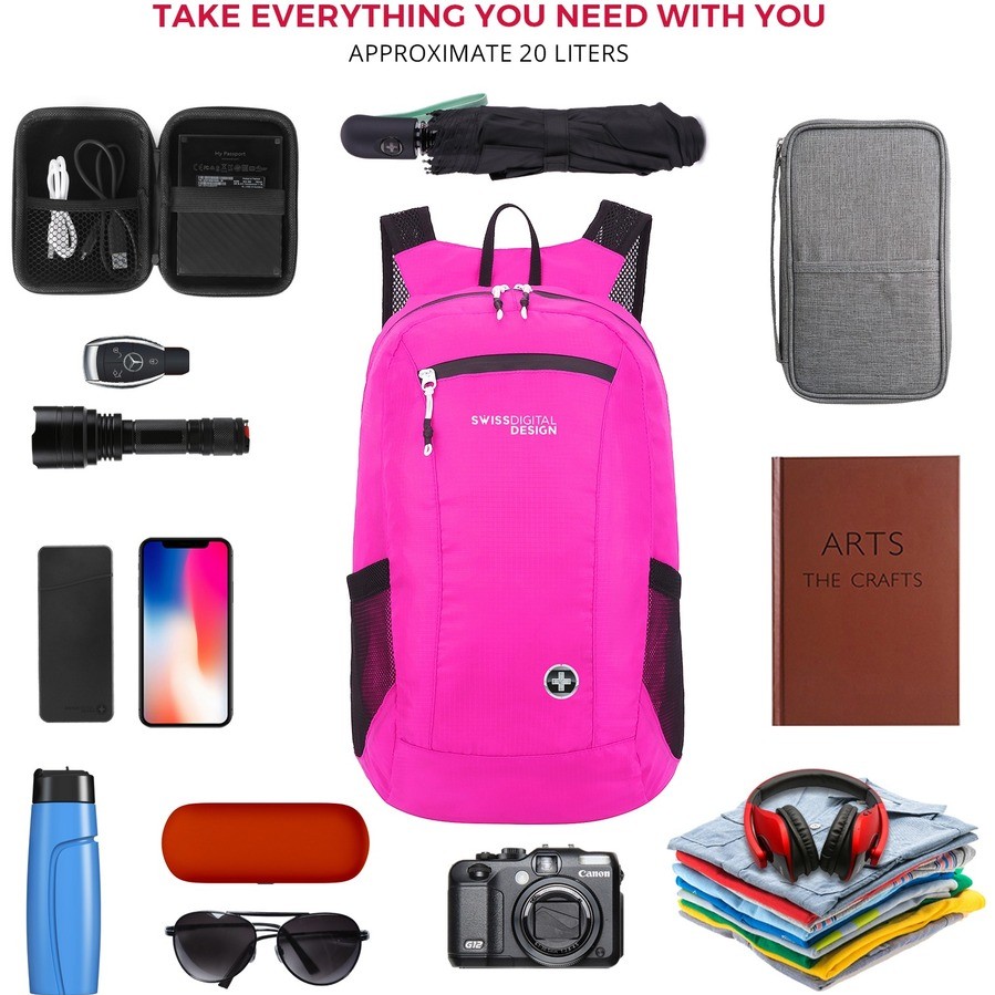 Swissdigital Design - SEAGULL - Ultra Lightweight Daypack for Travel with Large Capacity and Water Repellent Material in Fuchsia