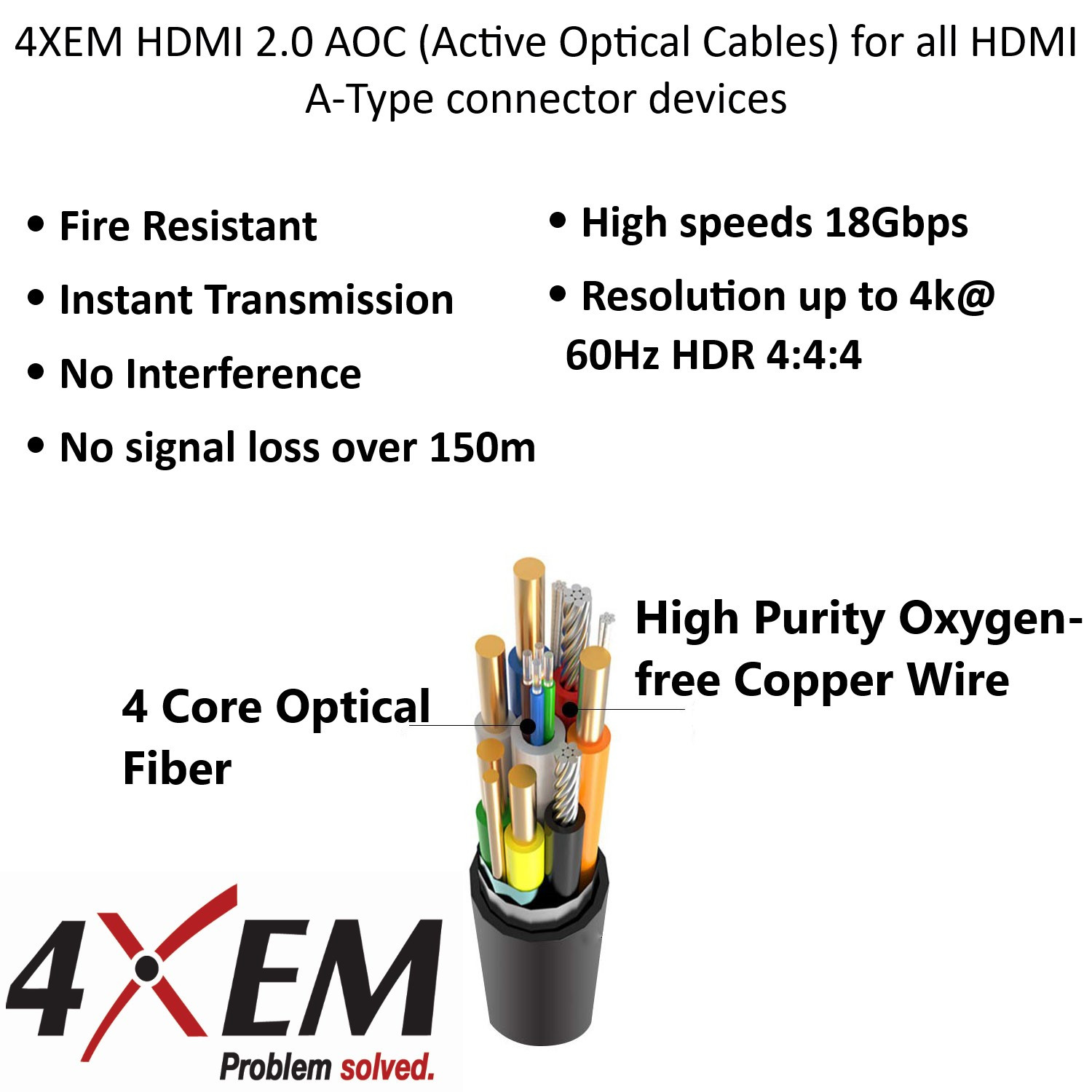 4XEM HDMI 2.0 AOC cables are completely compatible with all HDMI type A connector devices. All our Fiber HDMI cables support bandwidths up to 18Gbps and resolutions as high as 4K@60Hz. 4XEM’s UHD platinum fiber optic HDMI cable will easily connect all your high-definition A/V devices such as Blu-Ray players, HDTV’s, DVD players, DVR’s, game consoles and projectors to your high-definition screen. Our fiber optic HDMI 2.0 cables are perfect for your home theater, conference call, high-definition video, digital signage etc. Experience incredible detail with 4K HDR (High Dynamic Range).