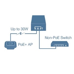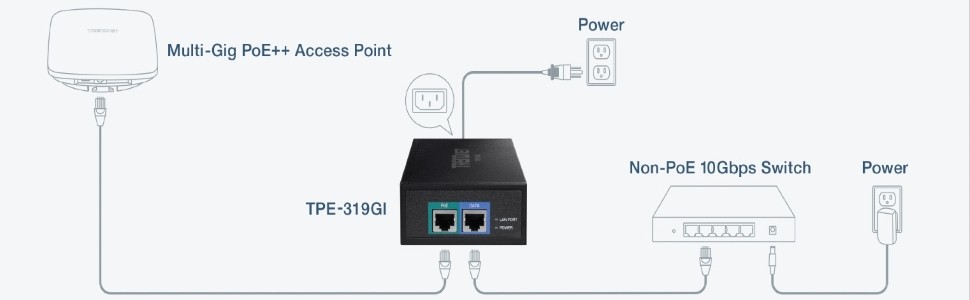 TRENDnet’s 10G PoE++ Injector, model TPE-319GI, combines electrical power with a 10GBASE-T network connection to produce a 10G PoE++ network signal. Auto-sensing technology conveniently delivers the correct wattage needed to power your PoE, PoE+ and PoE++ devices. Connect the 10G PoE++ injector to a non-PoE switch, and then run an Ethernet cable with data + power to network a PoE, PoE+ or PoE++ device up to 100 meters (328 ft.) over cat6a or better cabling. Network PoE devices such as wireless access points, IP cameras, VoIP phone systems, IPTV decoders, access controls, and more.