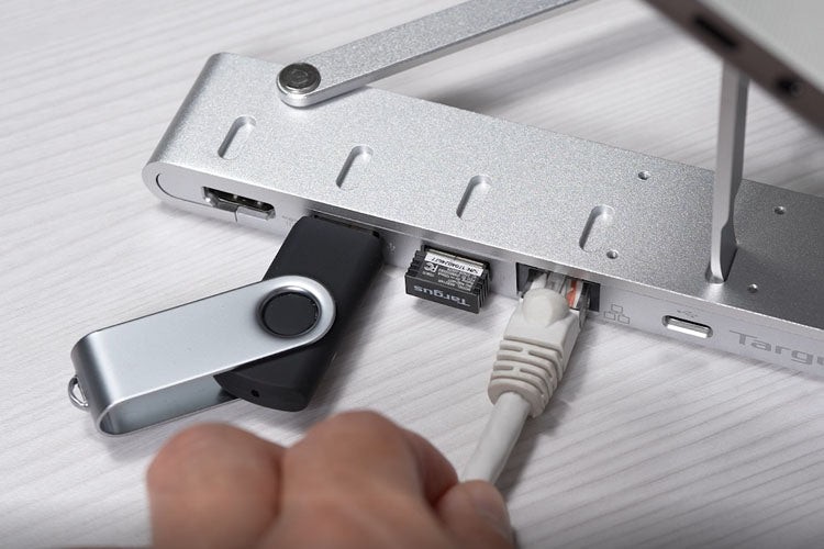 The Targus® Portable Laptop Stand + Integrated Dock combines the ergonomic support and space-saving convenience of a laptop stand with the multifunctionality of a docking station. Boasting an adjustable design with 5 different height positions, this stand optimizes airflow under your laptop and places it at a comfortable angle, which helps reduce neck and eye strain in nearly any work environment. The lightweight stand supports most laptops from 10 to 15.6 inches, and folds easily for convenient portability, while its high-quality aluminum allows for heat dissipation to help keep your laptop working efficiently.