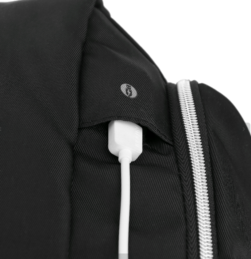 Pre-wired USB port on the side of the backpack for quick and easy charging of smartphones or other similar devices (battery not included).