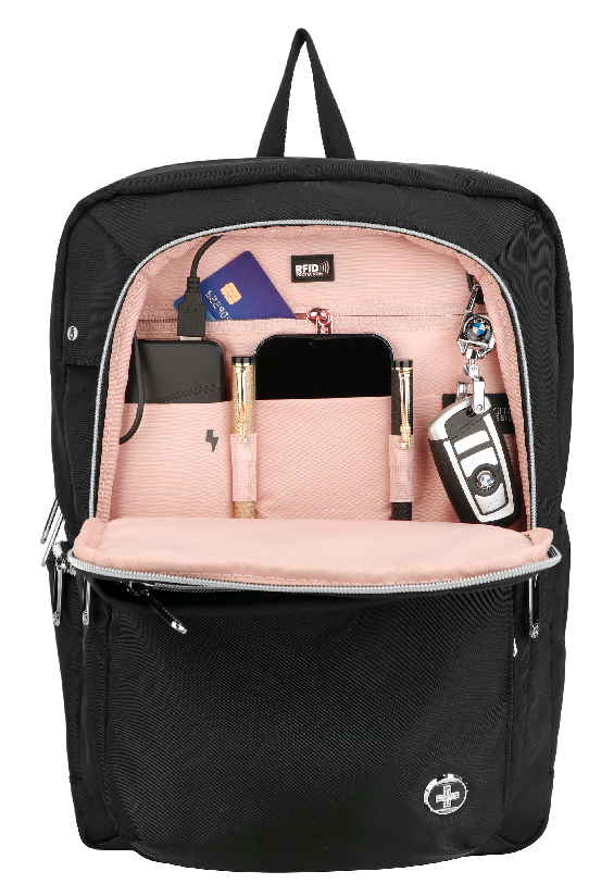 KATY ROSE backpack is a stylish black backpack with platinum accents. The bag is perfect for students and professionals. This bag is also equipped with a high airflow design and many storage options to best support you in your everyday life.