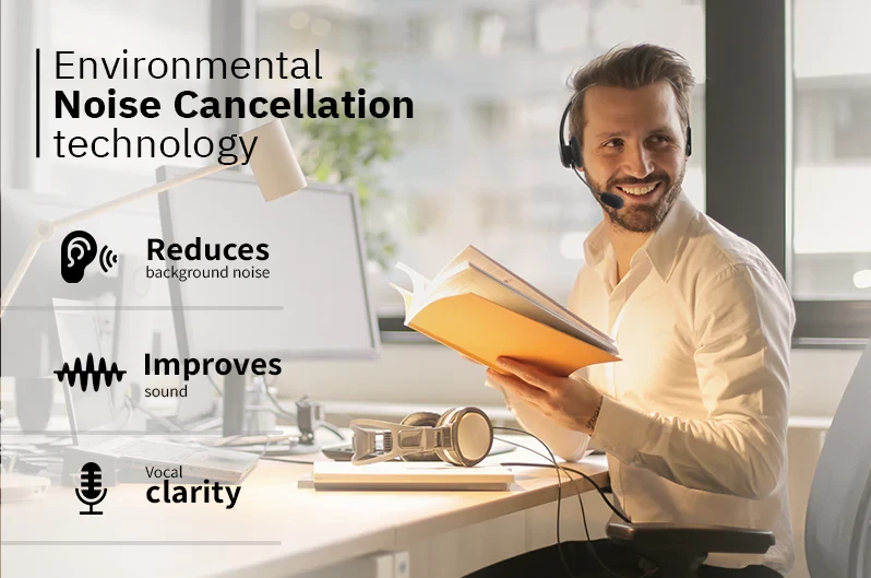 This headset adopts advanced ENC (environmental noise cancellation) technology which reduces background noise and improves sound and vocal clarity by using the microphone technology to detect background sounds, such as a loud office or children, and then uses an algorithm to cancel out the background sounds while focusing on the speaker’s human voice to ensure vocal clarity without audio clutter.