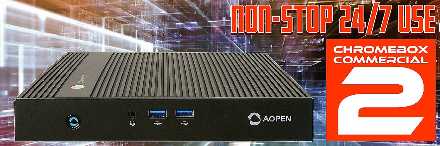 The AOPEN Chromebox Commercial 2 is a highly reliable and powerful device that operates 24/7 under tough conditions (up to 40ÂșC). It sets itself apart from any Chromebox, being a commercial-grade device, allowing speedy and secure signage from the cloud using Google Chrome OS. This time combined with the capability to run one UHD (4k) screen @60Hz, or two UHD (4k) screens @30Hz. Chrome Device Management Deployment and management of the devices have never been easier using Chrome Device Management. Use the signage app of your preference available via the Chrome Web Store to control what's on the screen. The Chromebox Commercial 2 comes with a standard 3 Year warranty with the option to purchase a 5-year warranty.
