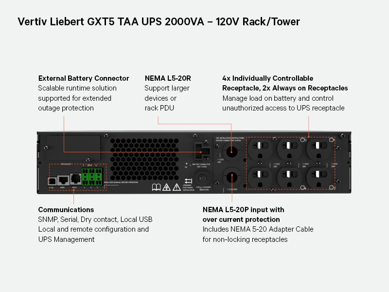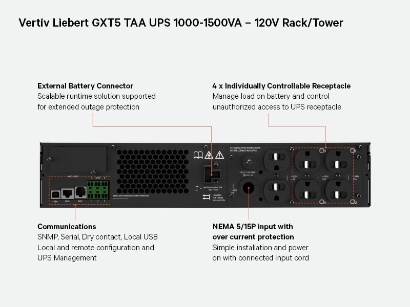 The Vertiv Liebert GXT5 TAA UPS provides online double conversion technology to protect critical equipment against outages. It offers continuous power conditioning to eliminate disturbances such as blackouts, brownouts, saps, surges or noise interference. During an outage, this UPS seamlessly transfers to battery with no interruption in power to supported equipment. Programmable sockets help extend runtime for the most critical loads and smart disconnection of the less critical equipment. Scalable runtime options with matching auto-detection external battery cabinets provide additional flexibility when extended uninterrupted power is required. The auto-detection feature of the external battery cabinet ensures the proper set-up and configuration of the system runtime allowing users to plan critical systems support accurately.