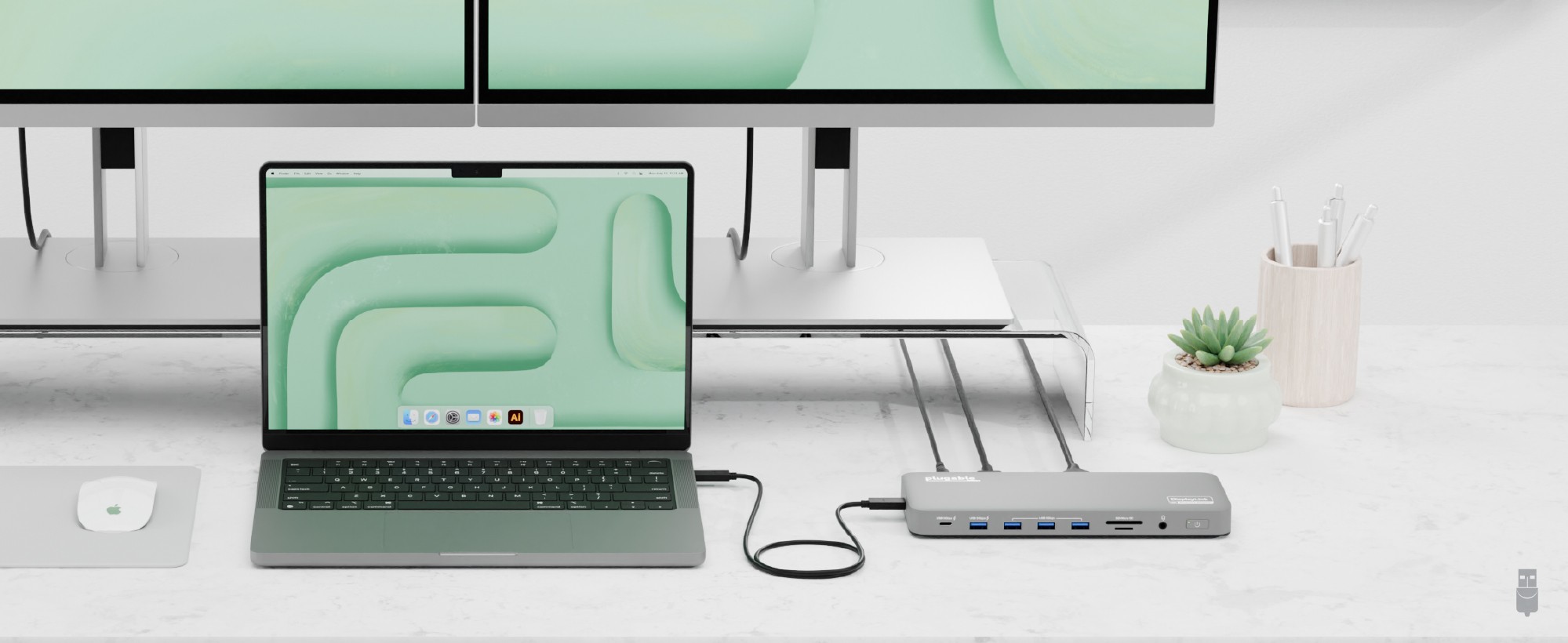 The 14-in-1 Dock for Mac features a aluminum casing with a space gray finish. This dock seamlessly integrates with your Mac to deliver exceptional performance. With 14 ports, including dual 4K monitor support via HDMI, DisplayPort or a mix of both, you can connect up to two screens at 4K 60Hz, even on Macs typically limited to a single extended monitor.