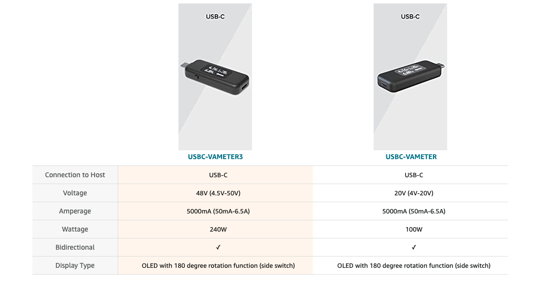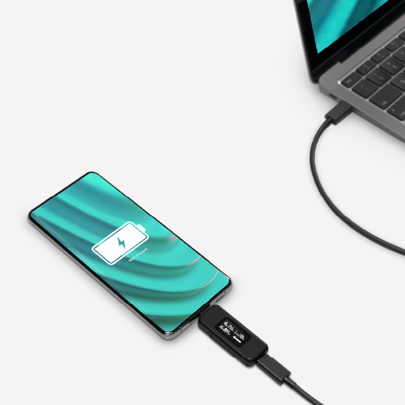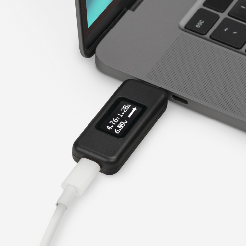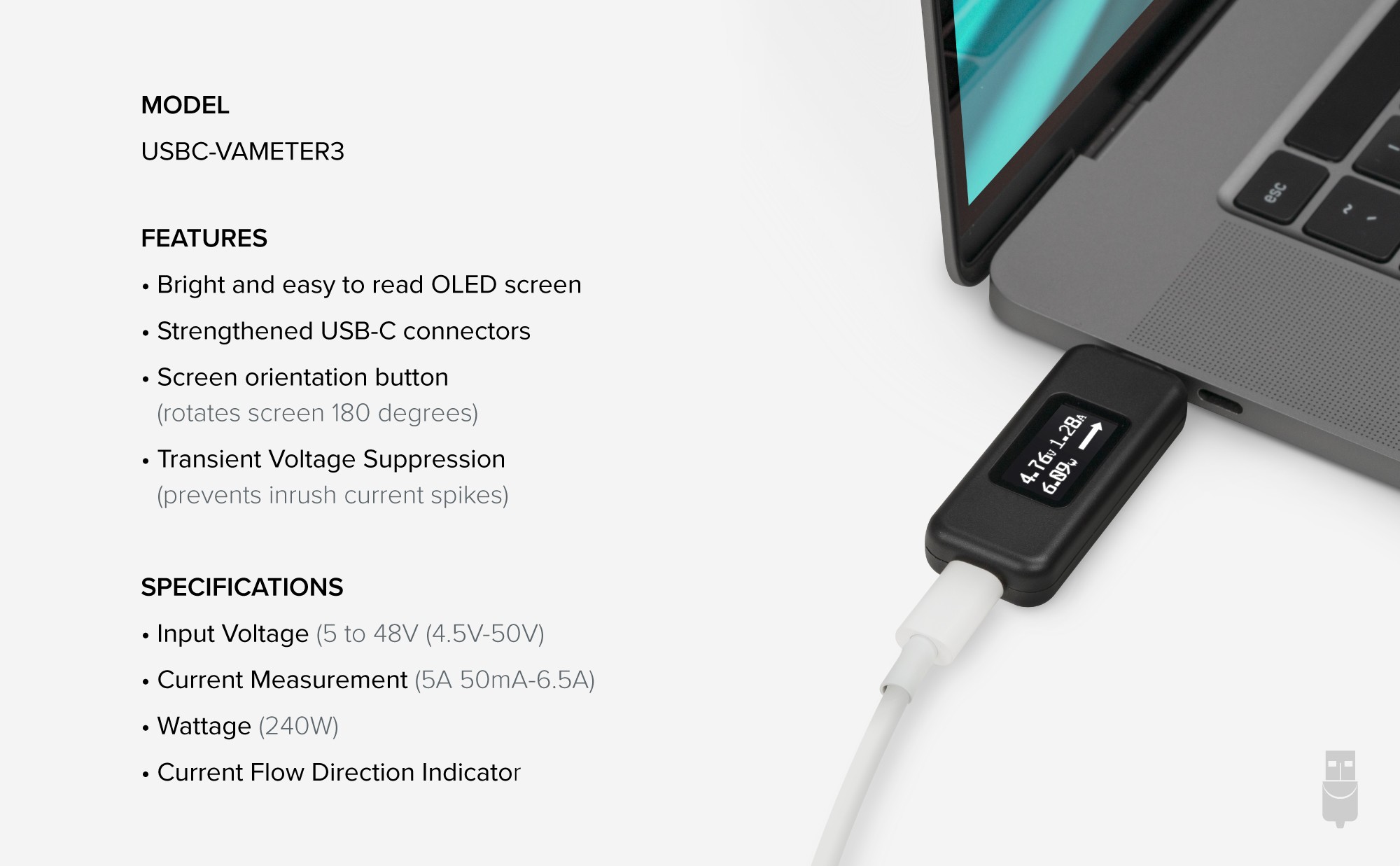 Connect the USBC-VAMETER3 inline between a USB-C host system like a laptop, tablet, or cell phone and a charger to use it as a USB voltage meter or power consumption meter. An updated OLED screen means a brighter and easier-to-read display in any lighting conditions, and a new orientation button lets you flip the screen with a click.