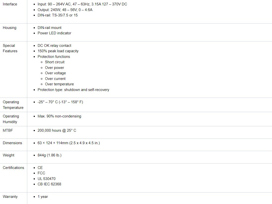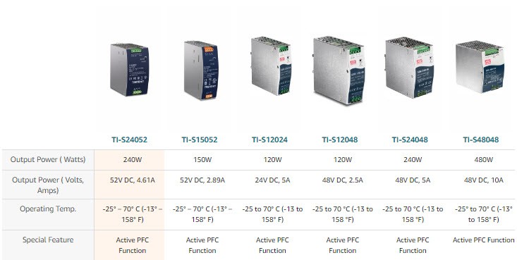TRENDnet’s AC to DC Industrial DIN-Rail Power Supply with PFC Function, model TI-S24052, supplies up to 240W (52V DC, 4.61A) of power to industrial equipment, such as PoE switches, injectors, and WiFi access points. This industrial power supply supports active PFC to help eliminate unusable reactive power and comes with an integrated DIN-Rail mount. It also supports protections for overload, short circuit, over voltage, over current, and over temperature. The industrial power supply is designed for industrial environments with an operating temperate range of -25° – 70° C (-13° – 158° F).