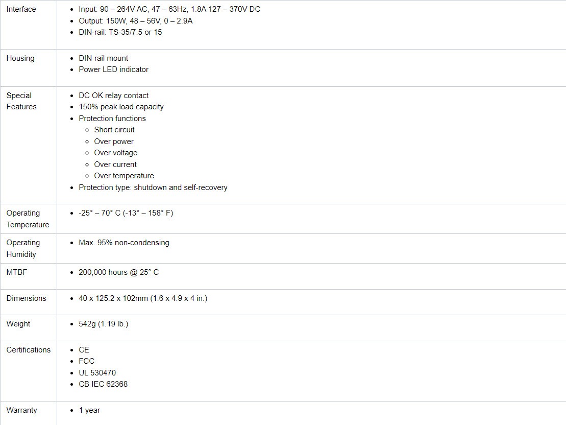 - DEVICE INTERFACE: Input: 90 – 264V AC, 47 – 63Hz, 1.8A 127 – 370V DC; Output: 150W, 48 – 56V, 0 – 2.9A; DIN-rail: TS-35/7.5 or 15