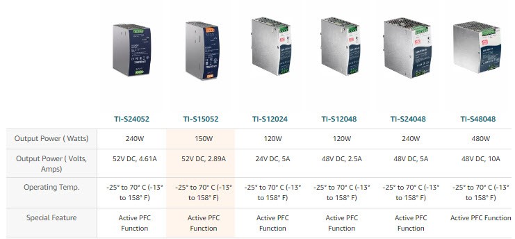 TRENDnet’s AC to DC Industrial DIN-Rail Power Supply with PFC Function, model TI-S15052, supplies up to 150W (52V DC, 2.89A) of power to industrial equipment, such as PoE switches, injectors, and WiFi access points. This DIN-Rail power supply comes with active PFC, an integrated DIN-rail mount, overload current protection.