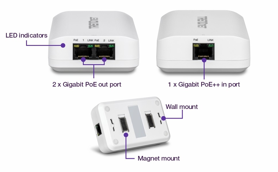 • DEVICE INTERFACE: 1 x Gigabit PoE++ In Port; 2 x Gigabit PoE Out Ports; LED Indicators
