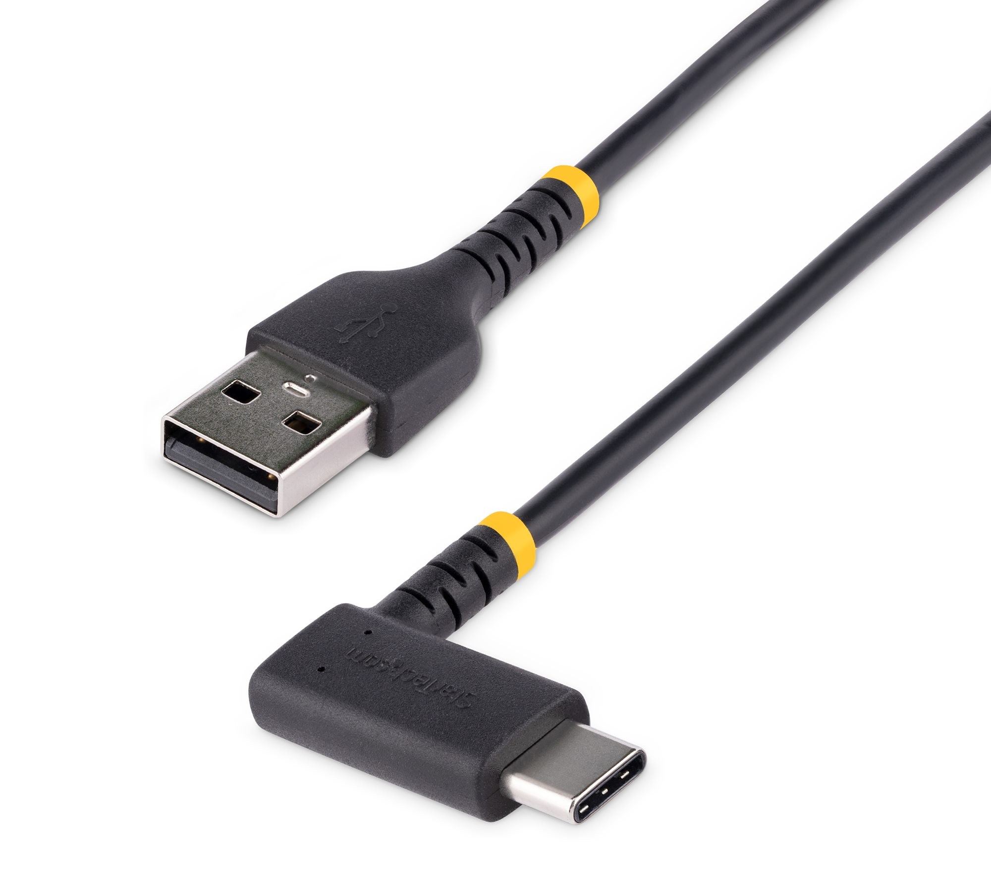 This rugged 6in (15cm) USB-A to right angle USB-C cable can be used to connect and/or charge a USB peripheral. Conveniently connect USB-C enabled devices at a right angle to the cable for organized cable routing solutions.