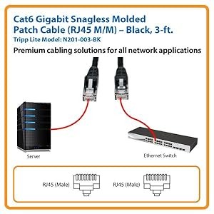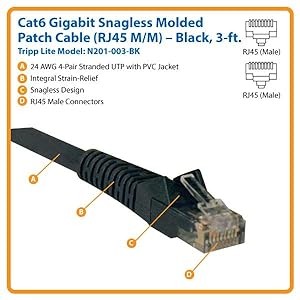 For peace of mind, this three-foot Tripp Lite Cat6 Gigabit Snagless Molded Patch Cable comes backed by a lifetime warranty. The N201-003-BK is manufactured in compliance with strict RoHS specifications, reflecting Tripp Lite’s commitment to environmental responsibility.