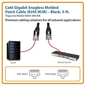 For peace of mind, this five-foot Tripp Lite Cat6 Gigabit Snagless Molded Patch Cable comes backed by a lifetime warranty. The N201-005-BK is manufactured in compliance with strict RoHS specifications, reflecting Tripp Lite’s commitment to environmental responsibility.