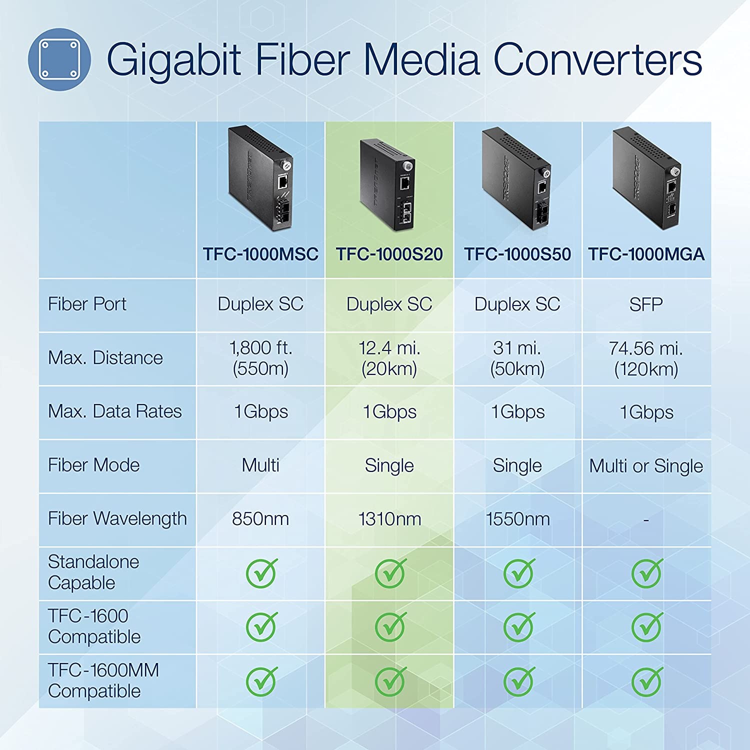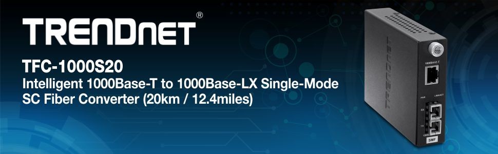 The TFC-1000S20 Intelligent Fiber Converter works with the TFC-1600 chassis system or as a standalone unit. This converter is a Single Mode SC-Type fiber converter that supports SNMP and spans distances up to 20km (12.4miles). Ports include 1 x 1000Base-T (RJ-45) port and 1 x 1000Base-LX (SC-Type) port.