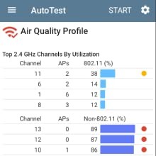 The Air Quality Test performs a scan of the channels in your wireless network to measure channel utilization and interference. Each table on the Air Quality results screen shows the top four channels in each band with the highest utilization or co-channel interference, along with the number of APs operating on the channel including adjacent channel interference detection in the 2.4GHz, 5GHz, and 6GHz (to detect 40, 80 and 160 MHz-wide overlapping BSSIDs).