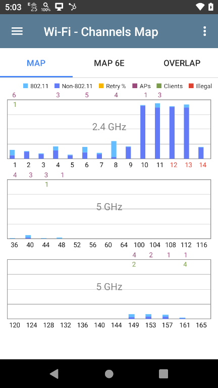 • 802.11 Utilization – Reports channels in each band (2.4 GHz and 5 GHz) with