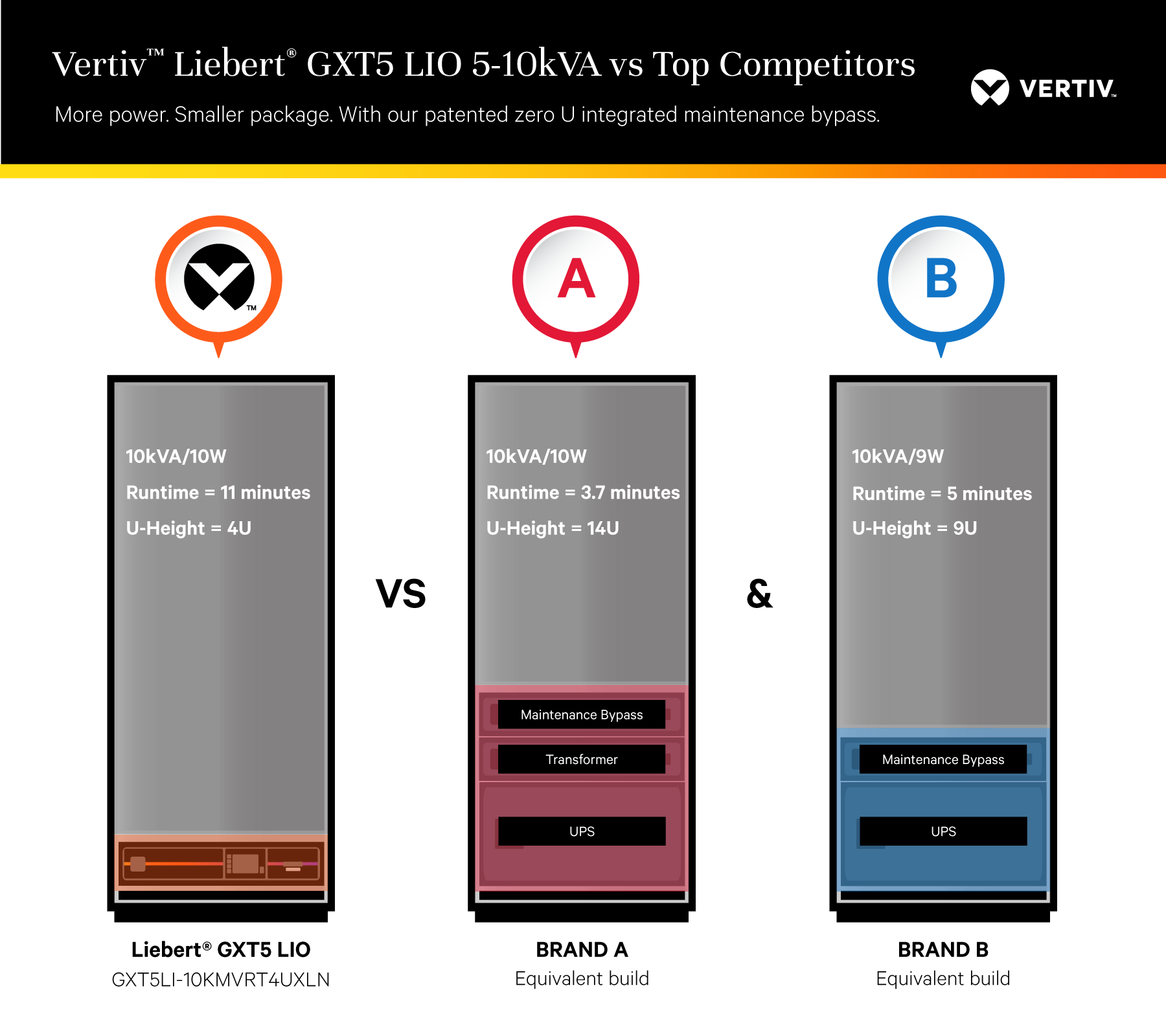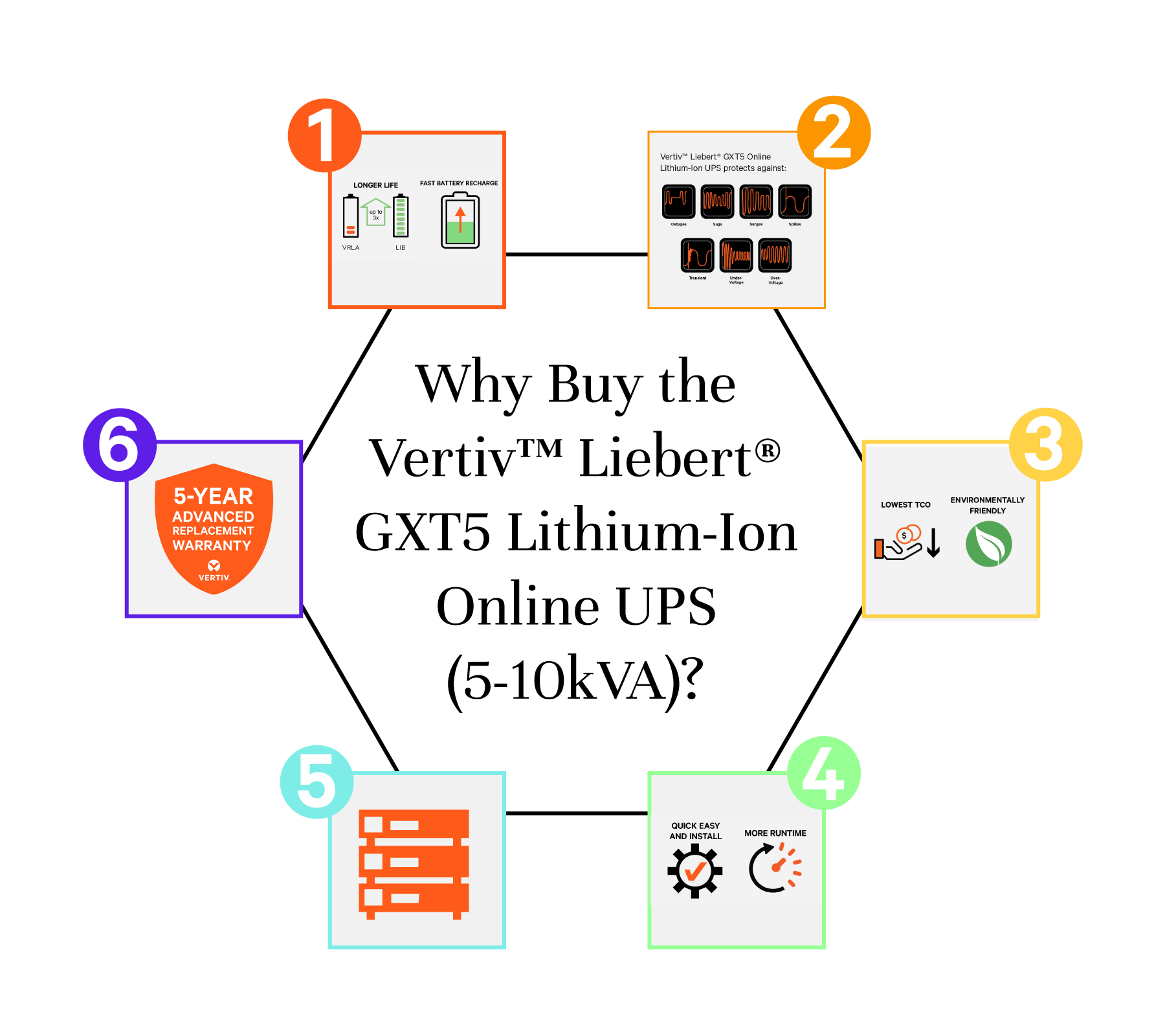 The Vertiv Liebert GXT5 Lithium-Ion UPS offers complete protection for the unique requirements of centrally managed IT assets in edge locations with limited trained IT/Infrastructure resources on-site. Where IT downtime can disrupt business and on-site personnel are unprepared to deal with service issues, this UPS delivers reliable and worry-free power protection. Its online double-conversion technology makes this it an ideal solution for network closets, server racks, customer tracking and security systems, and other critical equipment at the edge.