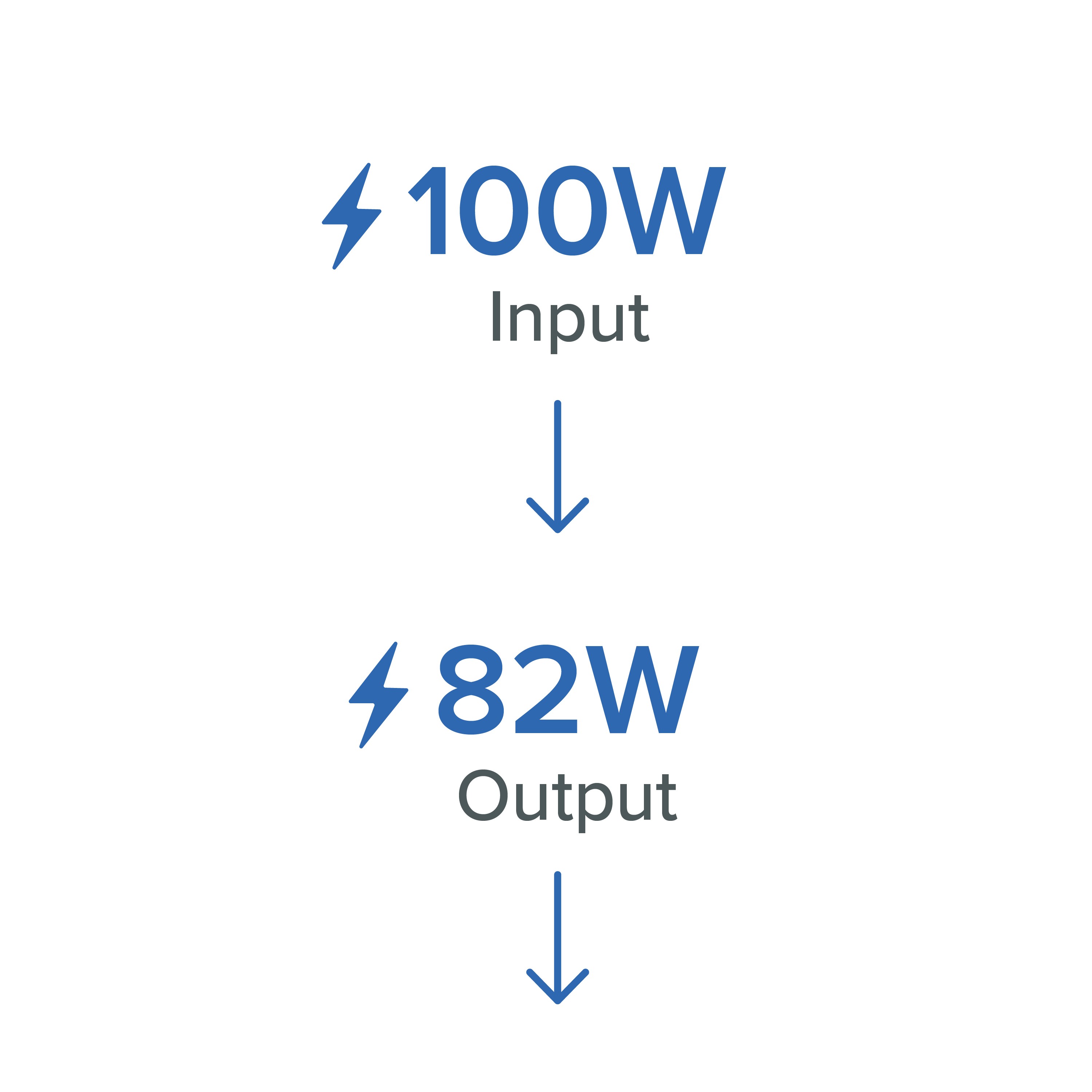 The dock will support up to a 100W power adapter, reserving up to 18W for itself. So if you have a 100W adapter, your computer will receive 82W of power—more than enough to keep you going all day. However, the computer may charge slower through the docking station than when directly connected to the power supply.