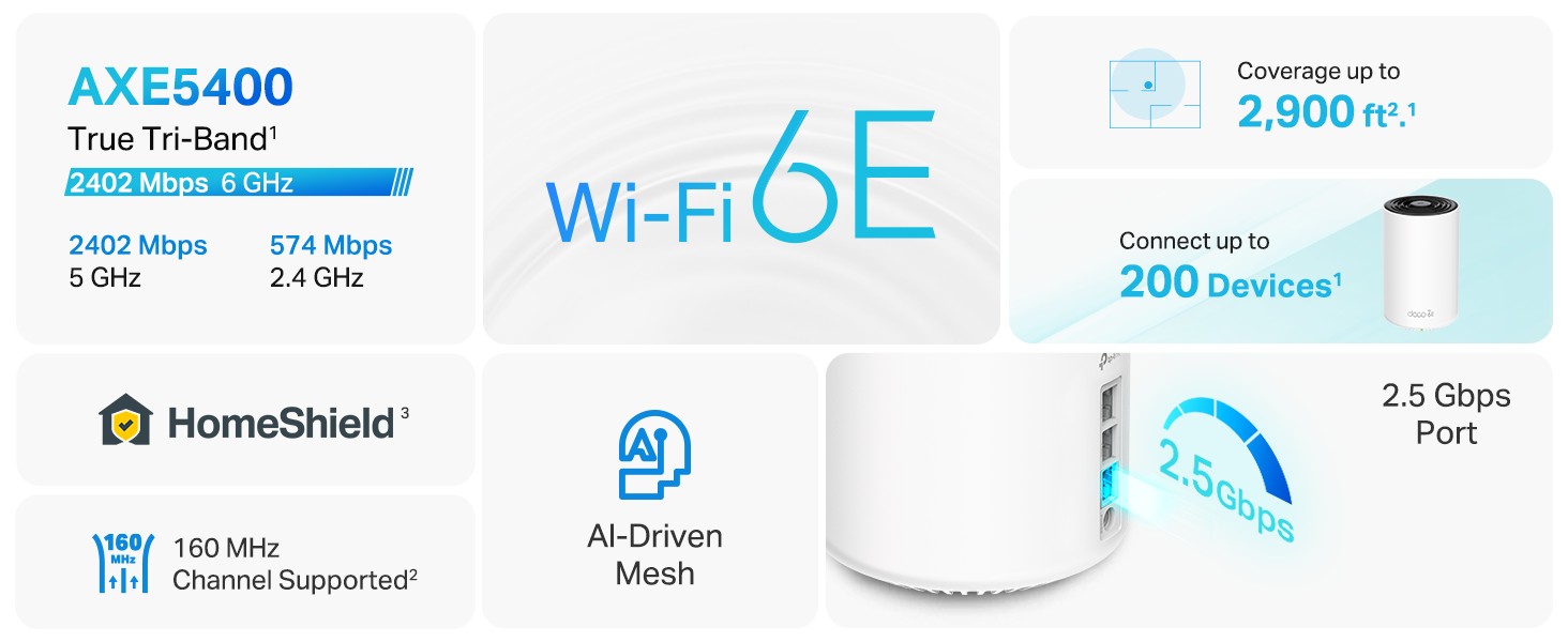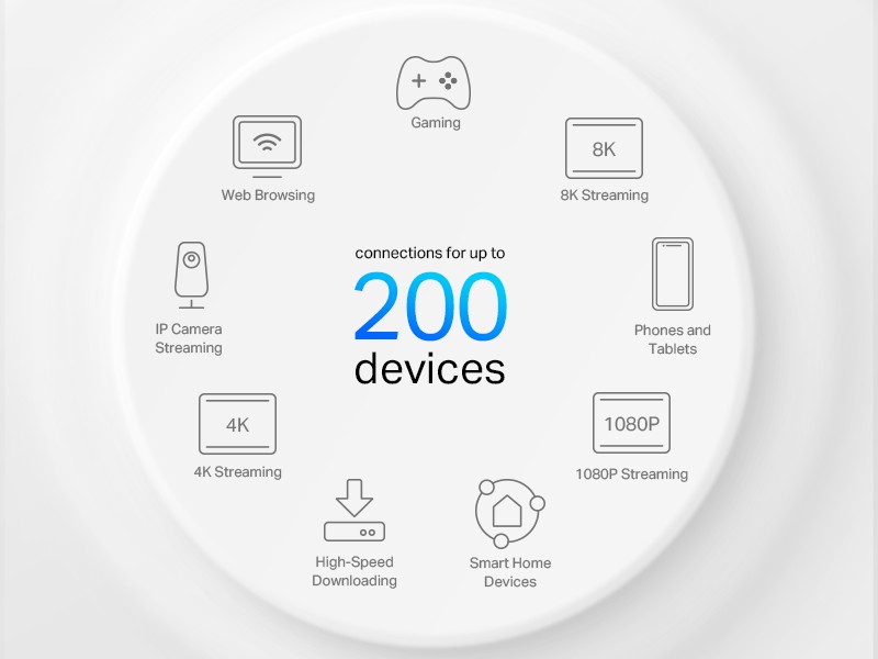 Enhanced by WiFi 6, featuring with OFDMA and MU-MIMO technology, Deco XE75 Pro allows you to connect up to 200 devices. Enjoy a more efficient network that loads faster without dragging down performance. ¹