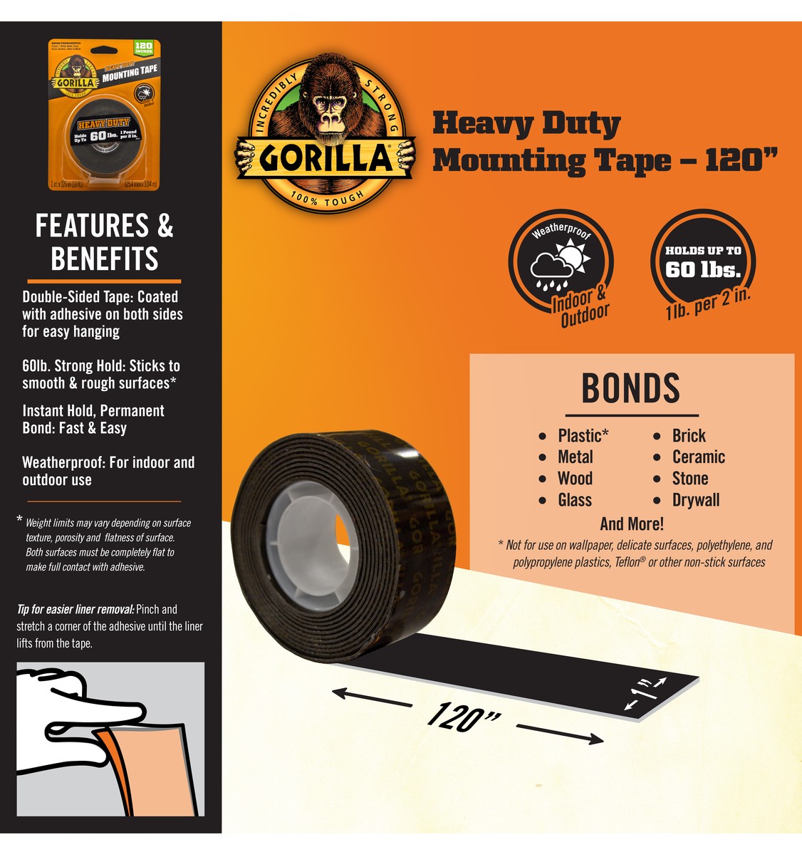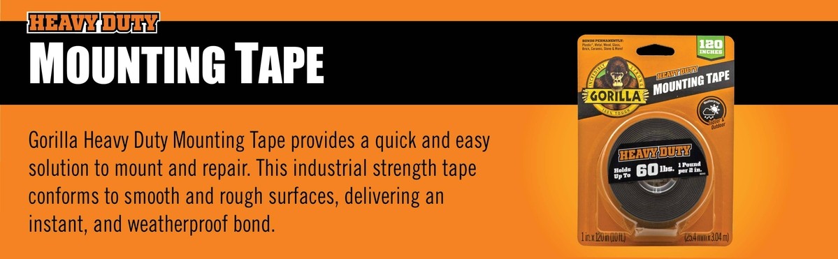Gorilla Heavy Duty Mounting Tape is perfect for indoor and outdoor projects and sticks to smooth and rough surfaces. Completing DIY projects is easy with this tough, double-sided tape. Mount, build, and repair!