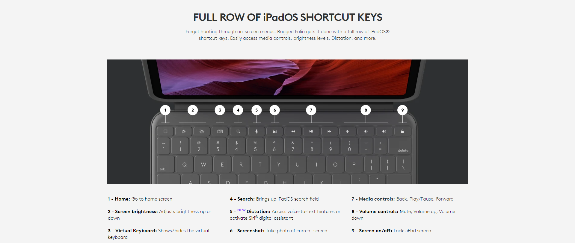 Rugged Folio for iPad is a slim keyboard case with drop protection that exceeds military standard tests. Enjoy a full-size keyboard with convenient iPadOS® shortcut keys, secure form-fit protection for your iPad, and a handy spot to stow Logitech Crayon or Apple Pencil. Plus, high performance spill and dirt-resistant sealed keys make this the perfect tool for on-the-go work