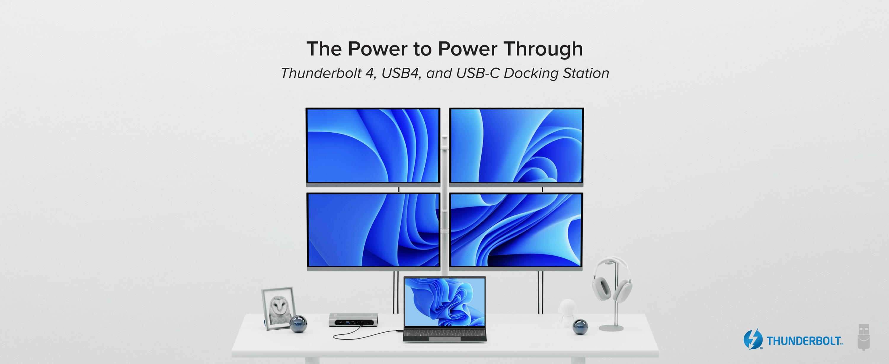 The Thunderbolt Certified 16-in-1 Quad docking station from Plugable delivers peak performance. The innovation starts with our display connections. Connect your 4K screens through 2x HDMI ports and 2x DisplayPort ports — a rare level of display flexibility in a Thunderbolt dock. But the real expansion picks up at the ports. Offering sixteen total ports to park your peripherals, including 7x USB ports, SD and microSD card readers, Audio, and 2.5Gbps Ethernet. It even adapts to your desk with an included stand for vertical or horizontal orientation options.