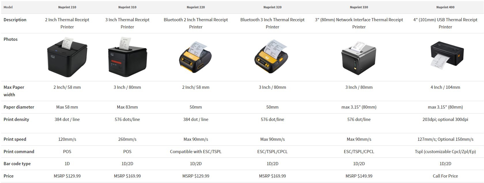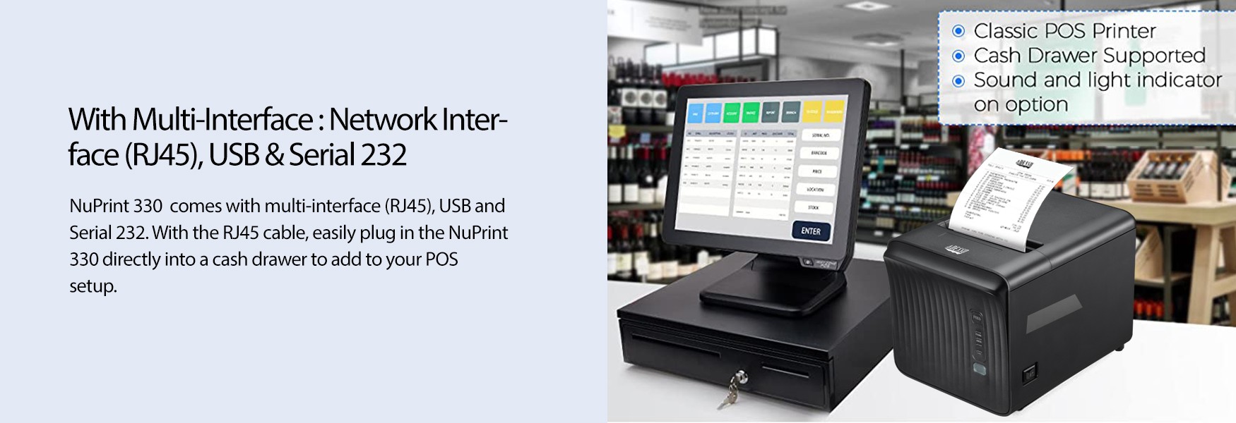 Whether you are in a retail environment, a restaurant environment, a small convenience store, or ANY POS environment, with the NuPrint 330 you can print various 1D or 2D barcodes such as UPC-A, UPC-E, JAN13, EAN13, Code 39, Code 128, and QR code etc.