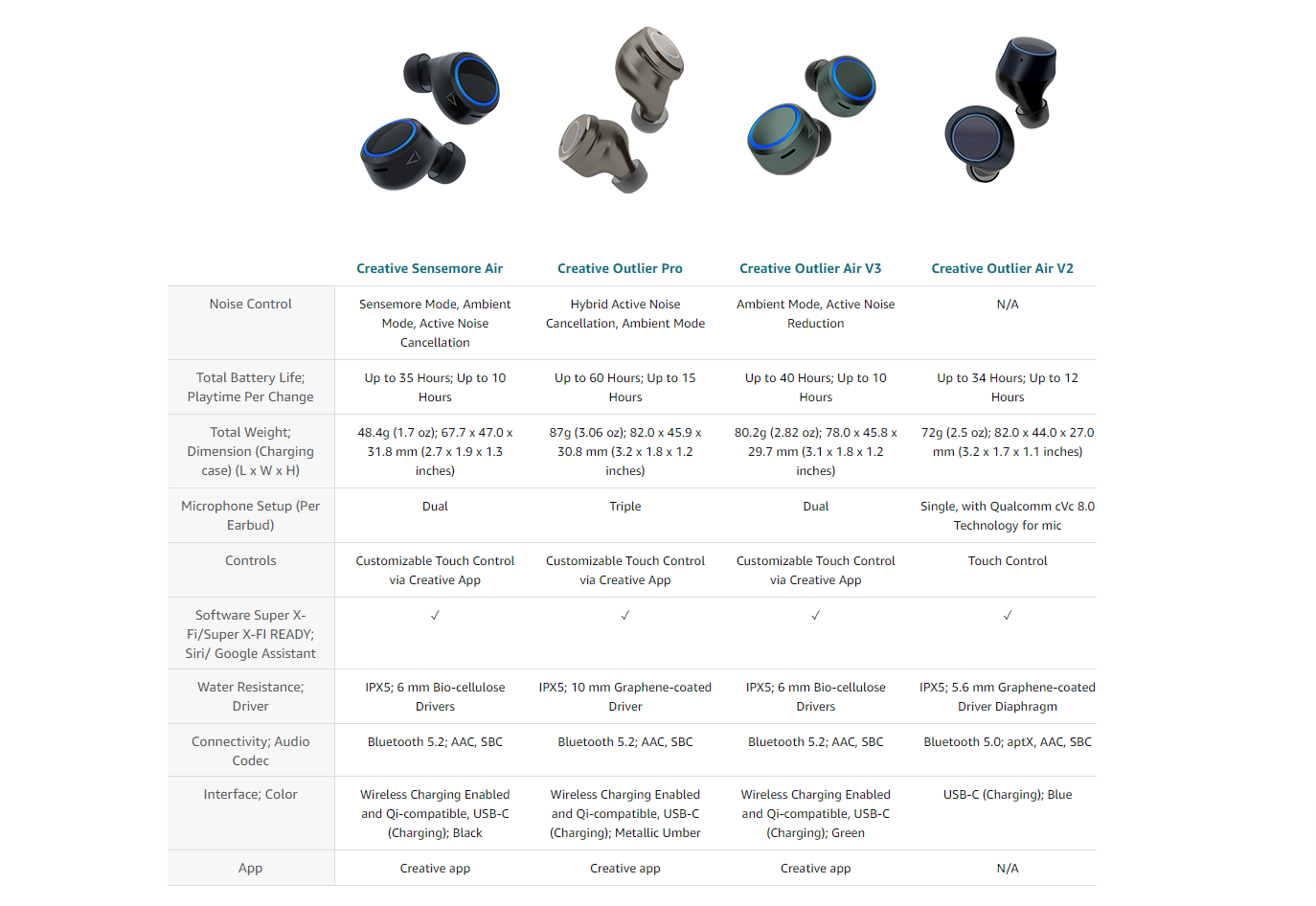 CUSTOMIZE EVERYTHINGOur Creative app allows you to tailor features such as Sensemore Mode, Ambient Mode, or ANC to set the amount of sound you wish to hear, and customize control buttons like answer / reject calls, Siri / Google Assistant, and even playback buttons. |